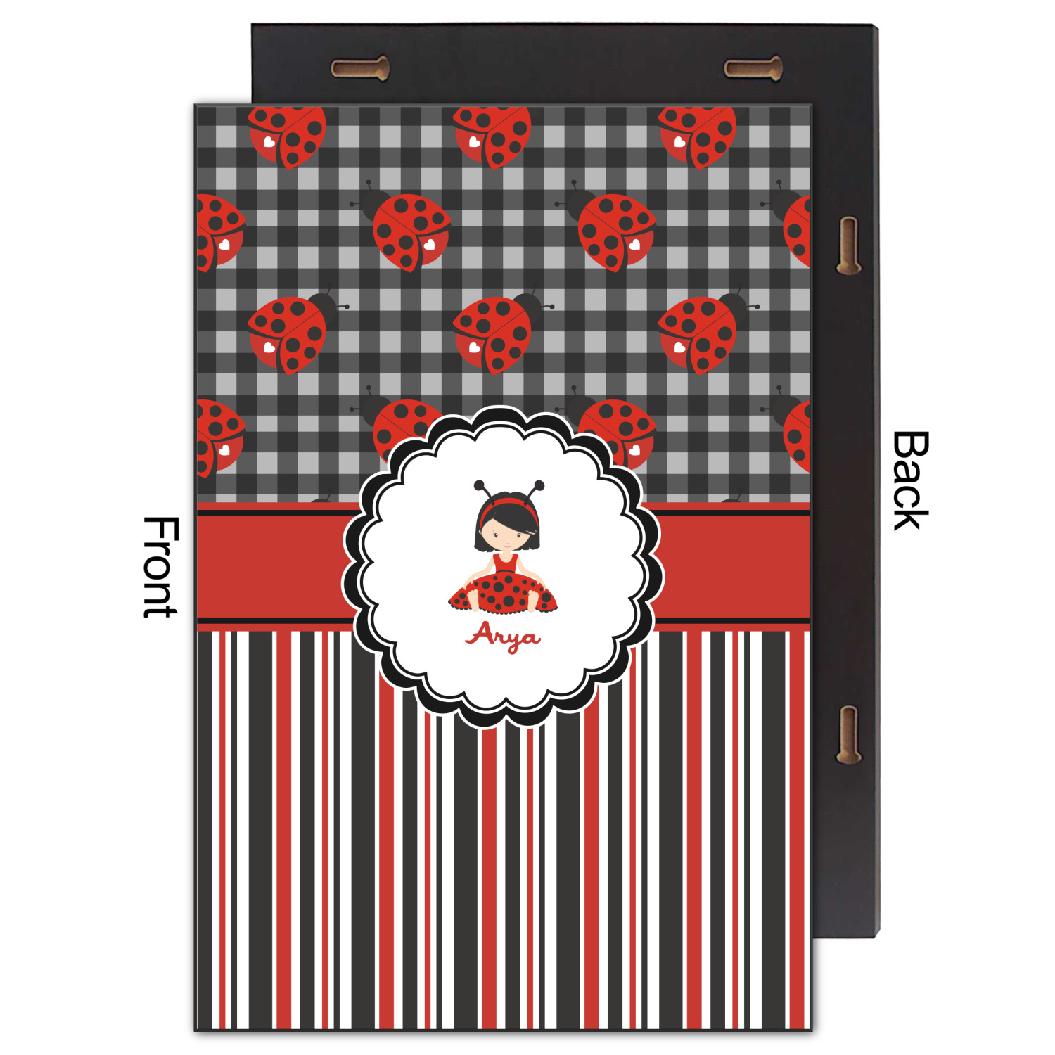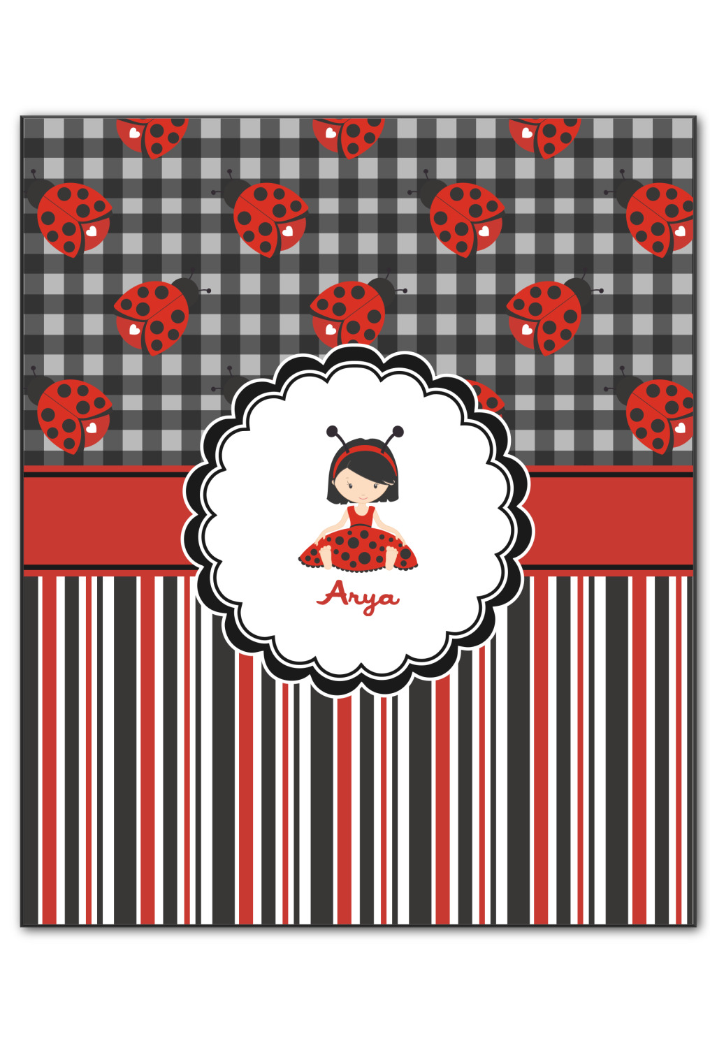 A wide band of red with an inset of black trim pulls the design together. A cute little girl dressed as a ladybug sits in the middle of a white scalloped circle label that is trimmed in double rows of black. Under the ladybug girl is ample room for custom personalization.