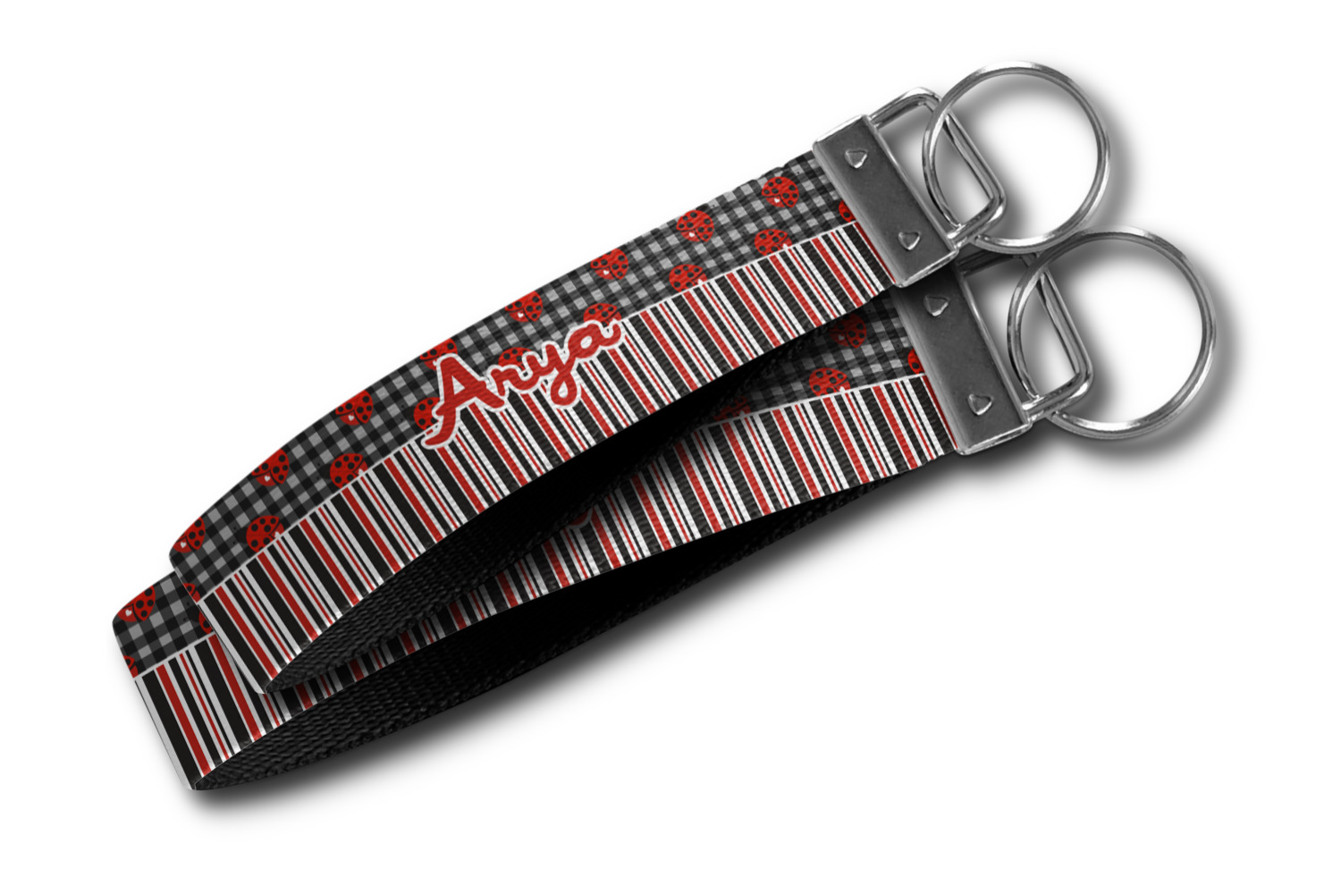 These key fob keychains are made from a polyester weave, right here in the USA. They feature a silver, metal clasp, attached to a round keyring. The piece gives the personalized wristlet a beautiful, finished look. Your customized design is printed on the outside of the keychain strap. We carry these wristlets in two sizes: small, which is 5 inches in width, and large, which is 5.5 inches in width.