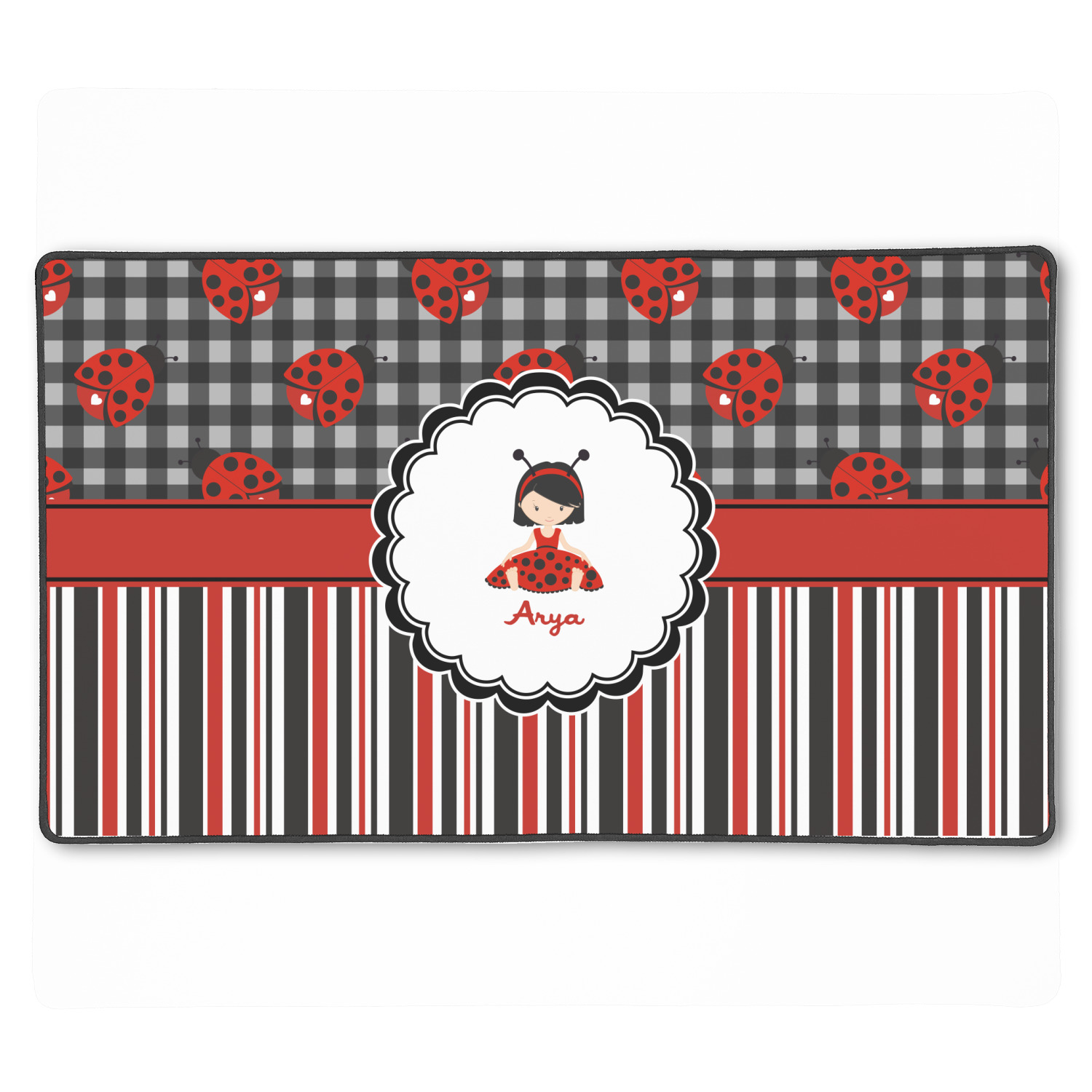 A wide band of red with an inset of black trim pulls the design together. A cute little girl dressed as a ladybug sits in the middle of a white scalloped circle label that is trimmed in double rows of black. Under the ladybug girl is ample room for custom personalization.