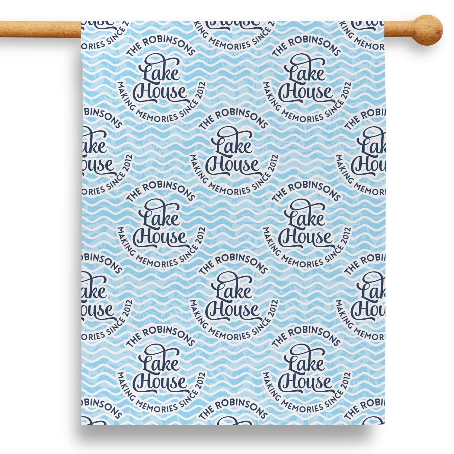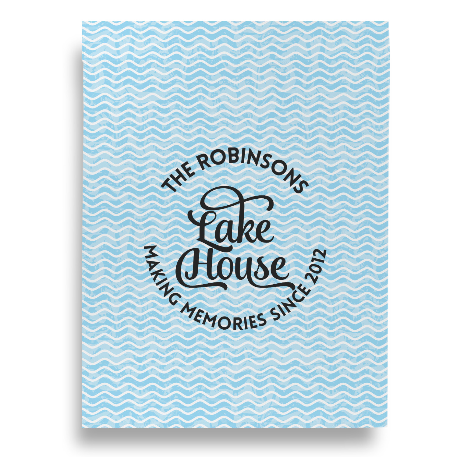 This Lake House Design is serene and calm. We create a "personalized" pattern for this design. The pattern consists of serene blue waves and a round badge that has the words Lake House in the middle. The top text & bottom texts can be customized; we chose to use the family name for the top and instead of using established in 2012, we chose to use the words "Making Memories Since 2012".