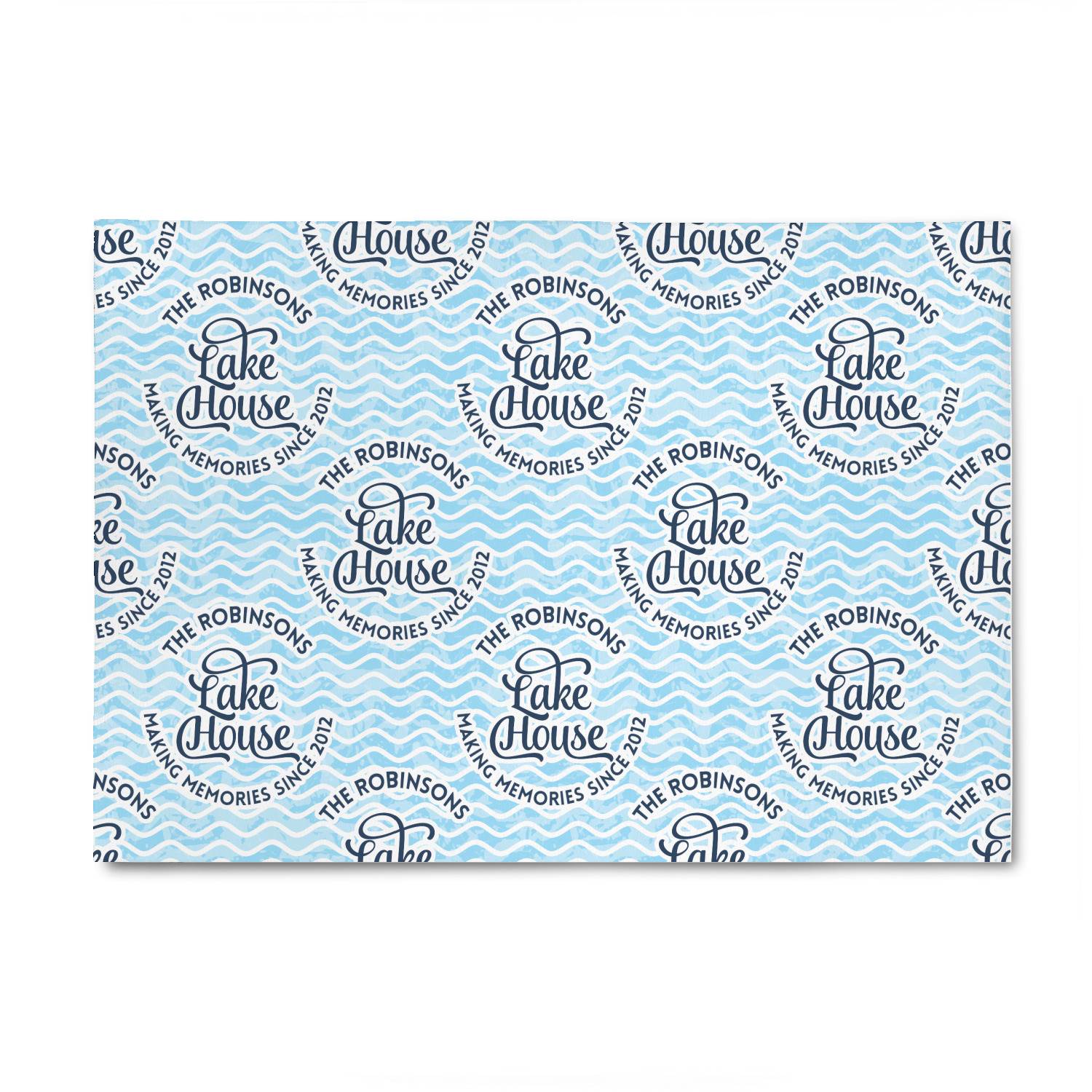 This Lake House Design is serene and calm. We create a "personalized" pattern for this design. The pattern consists of serene blue waves and a round badge that has the words Lake House in the middle. The top text & bottom texts can be customized; we chose to use the family name for the top and instead of using established in 2012, we chose to use the words "Making Memories Since 2012".