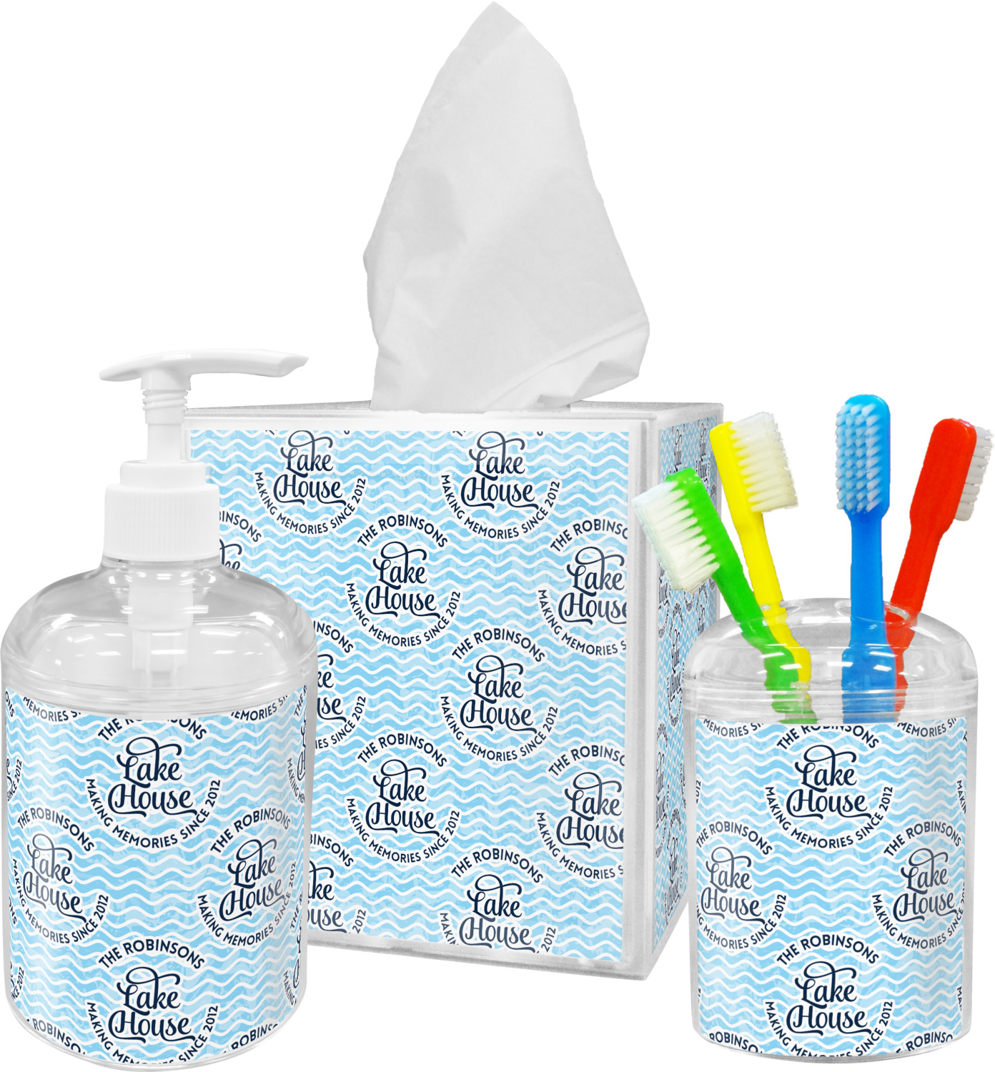 Your bathroom accessories set includes a tissue box cover, a toothbrush holder, and an acrylic soap dispenser. When purchased together, you can make a coordinating set, and save money, as the set is cheaper than purchasing each item individually.