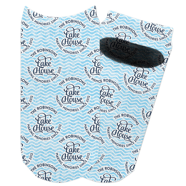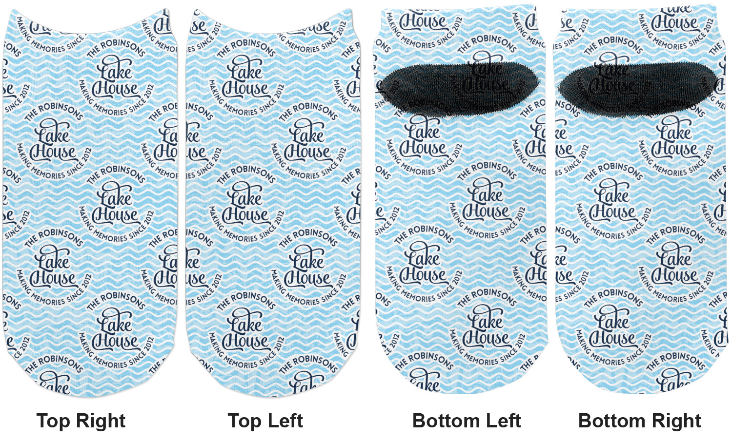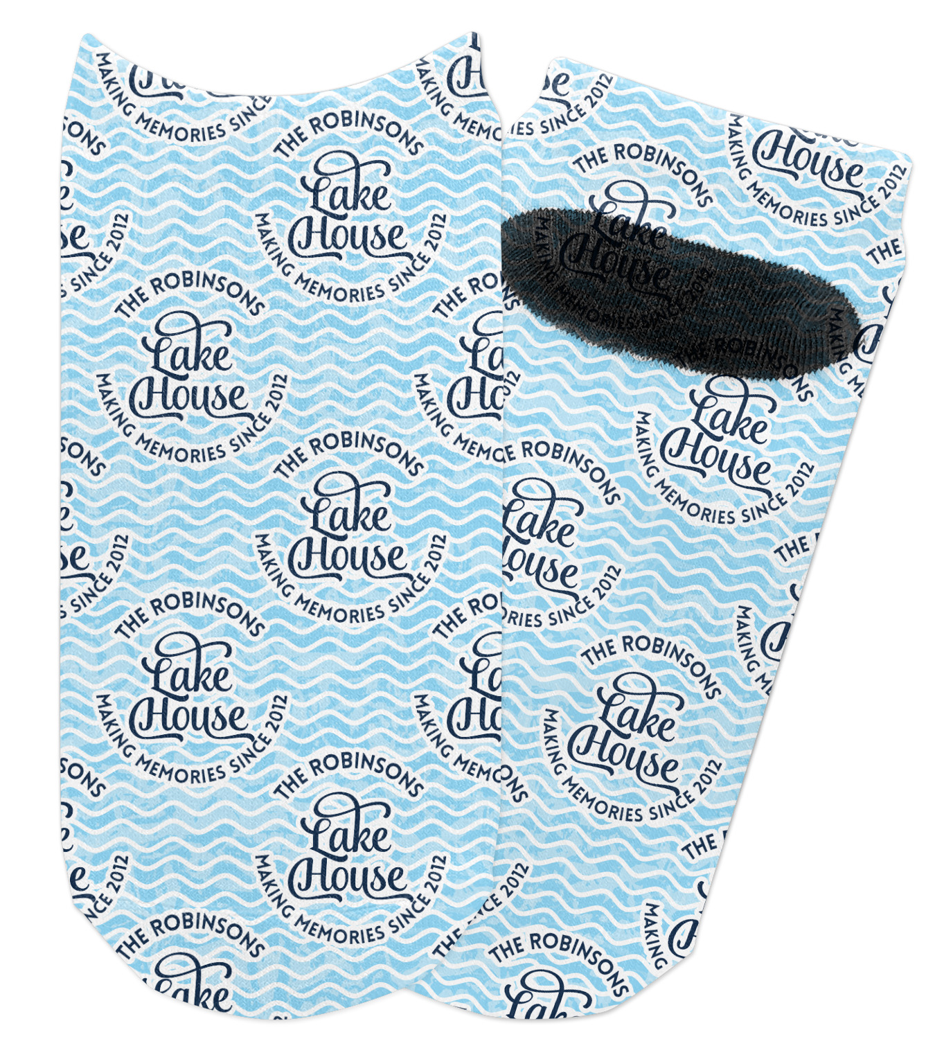 This Lake House Design is serene and calm. We create a "personalized" pattern for this design. The pattern consists of serene blue waves and a round badge that has the words Lake House in the middle. The top text & bottom texts can be customized; we chose to use the family name for the top and instead of using established in 2012, we chose to use the words "Making Memories Since 2012".