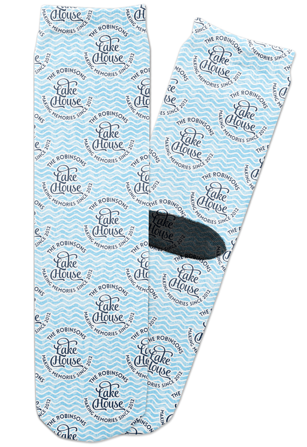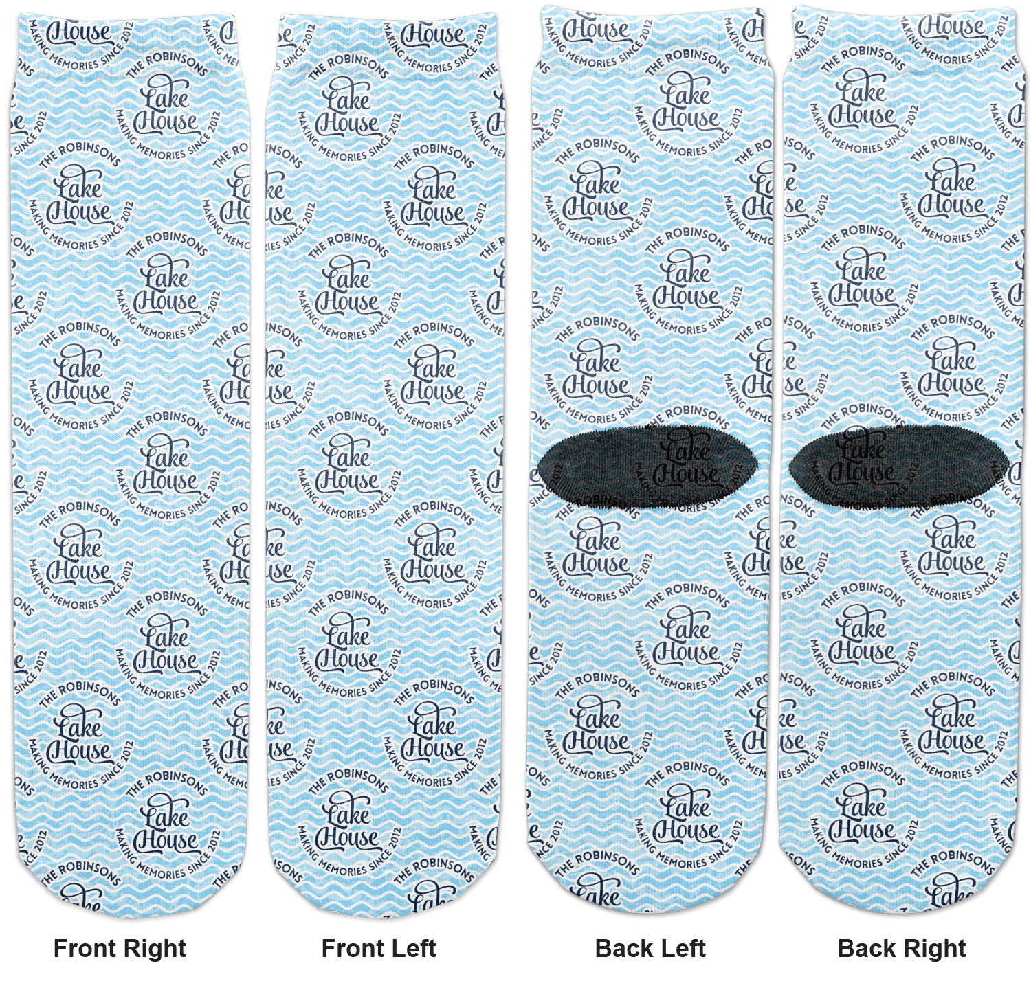 This Lake House Design is serene and calm. We create a "personalized" pattern for this design. The pattern consists of serene blue waves and a round badge that has the words Lake House in the middle. The top text & bottom texts can be customized; we chose to use the family name for the top and instead of using established in 2012, we chose to use the words "Making Memories Since 2012".