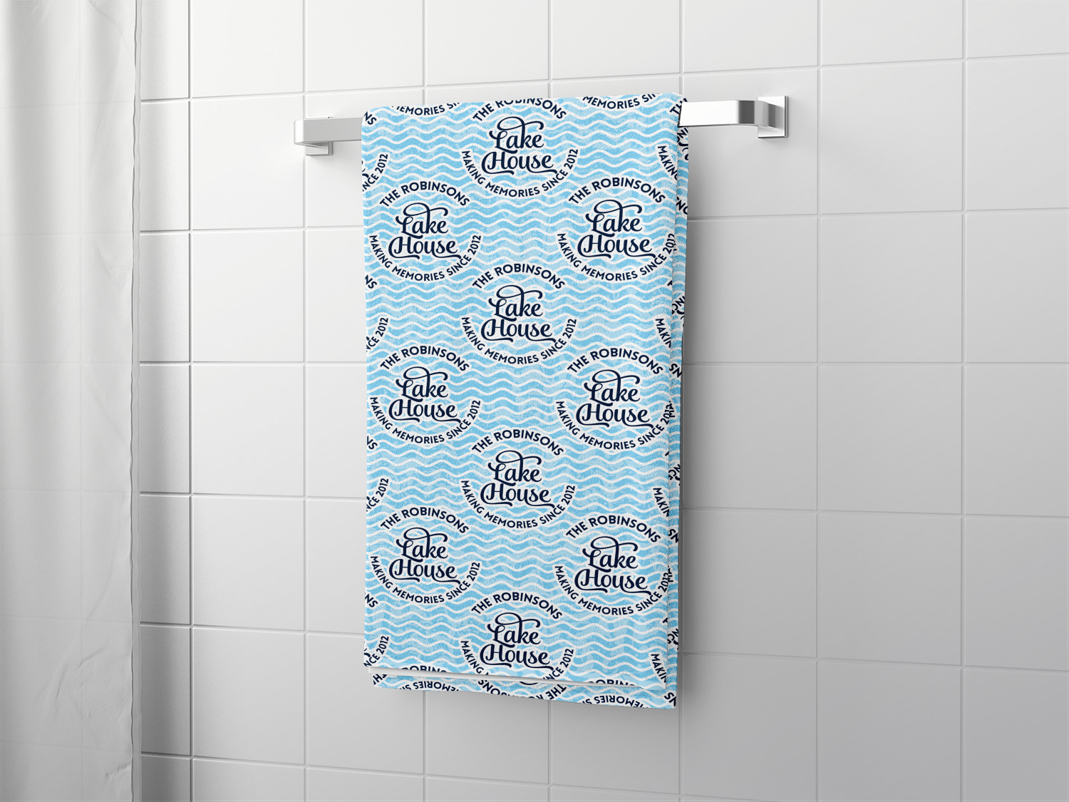 This Lake House Design is serene and calm. We create a "personalized" pattern for this design. The pattern consists of serene blue waves and a round badge that has the words Lake House in the middle. The top text & bottom texts can be customized; we chose to use the family name for the top and instead of using established in 2012, we chose to use the words "Making Memories Since 2012".