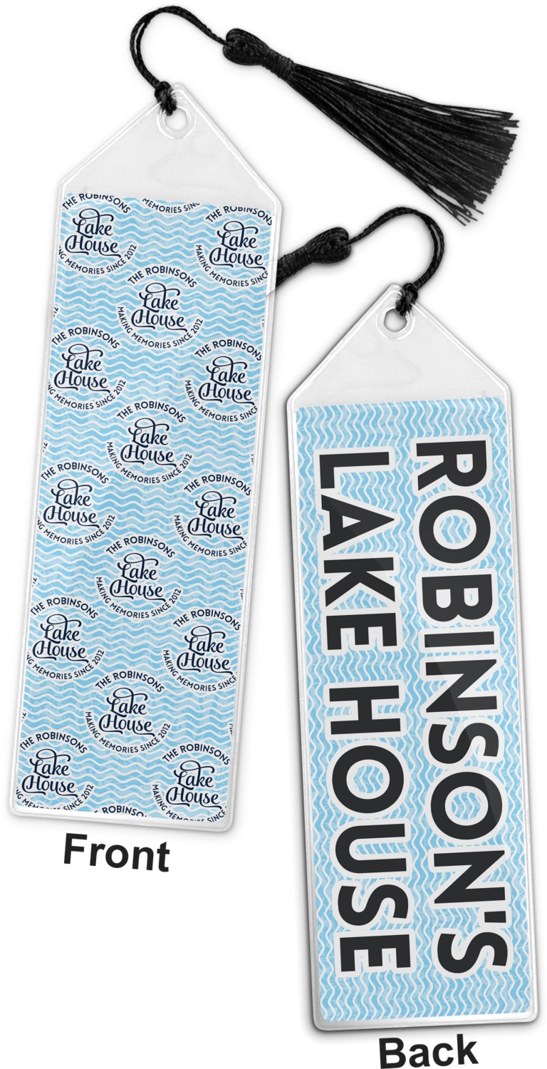 Your personalized bookmark is made of a sturdy, clear vinyl, and is approximately 7.5" x 2.25". We display your personalization on vinyl inserts that are placed on both sides. Accompanying each book marker is a black, fringe tassel that attaches to the reinforced, triangular header.