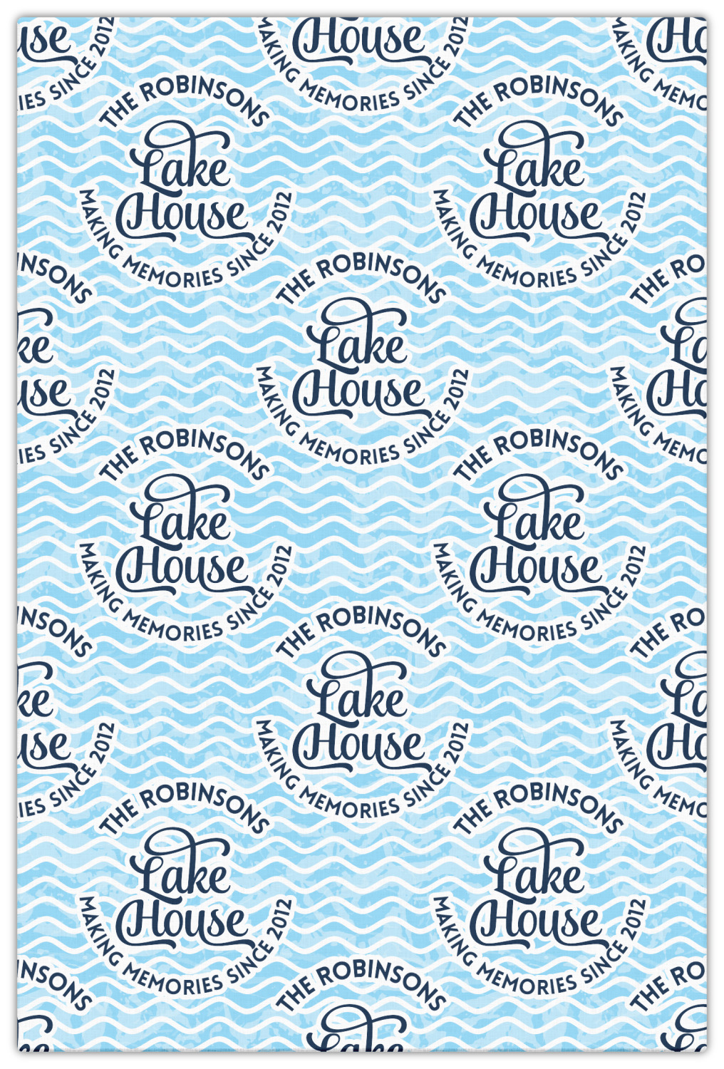 This Lake House Design is serene and calm. We create a "personalized" pattern for this design. The pattern consists of serene blue waves and a round badge that has the words Lake House in the middle. The top text & bottom texts can be customized; we chose to use the family name for the top and instead of using established in 2012, we chose to use the words "Making Memories Since 2012".