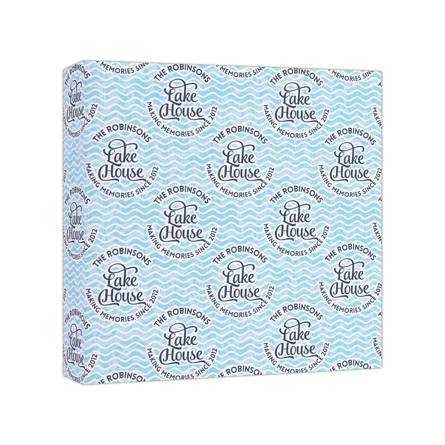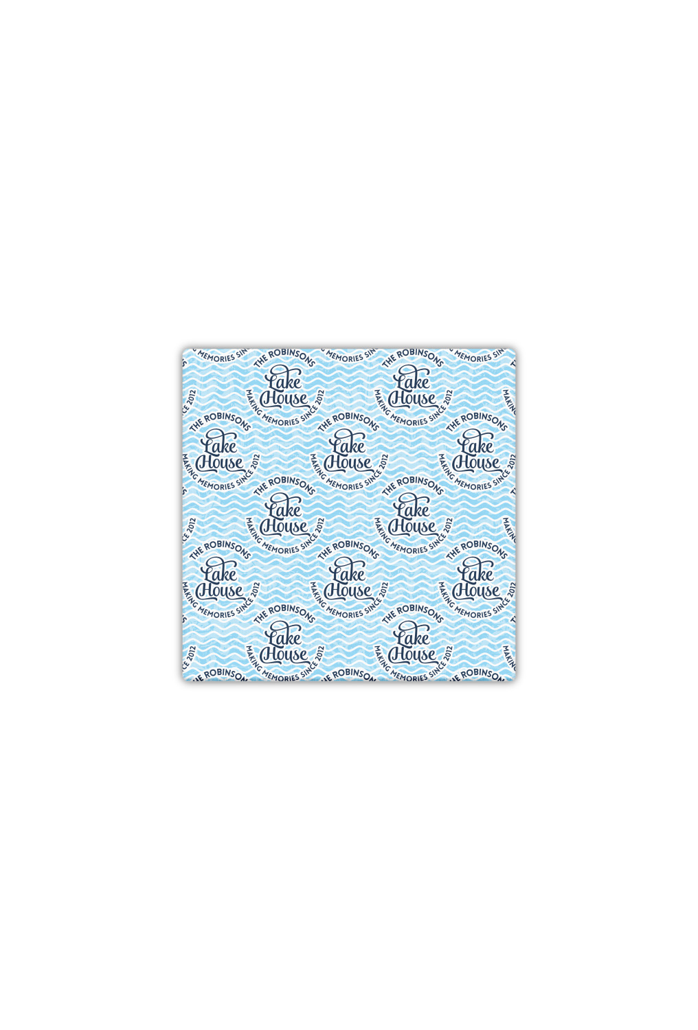 This Lake House Design is serene and calm. We create a "personalized" pattern for this design. The pattern consists of serene blue waves and a round badge that has the words Lake House in the middle. The top text & bottom texts can be customized; we chose to use the family name for the top and instead of using established in 2012, we chose to use the words "Making Memories Since 2012".