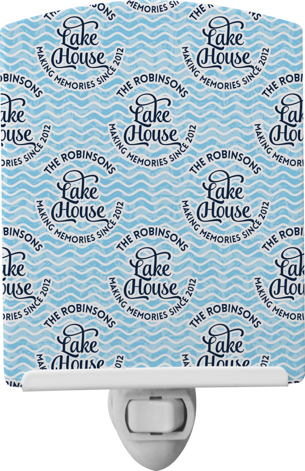 This Lake House Design is serene and calm. We create a "personalized" pattern for this design. The pattern consists of serene blue waves and a round badge that has the words Lake House in the middle. The top text & bottom texts can be customized; we chose to use the family name for the top and instead of using established in 2012, we chose to use the words "Making Memories Since 2012".
