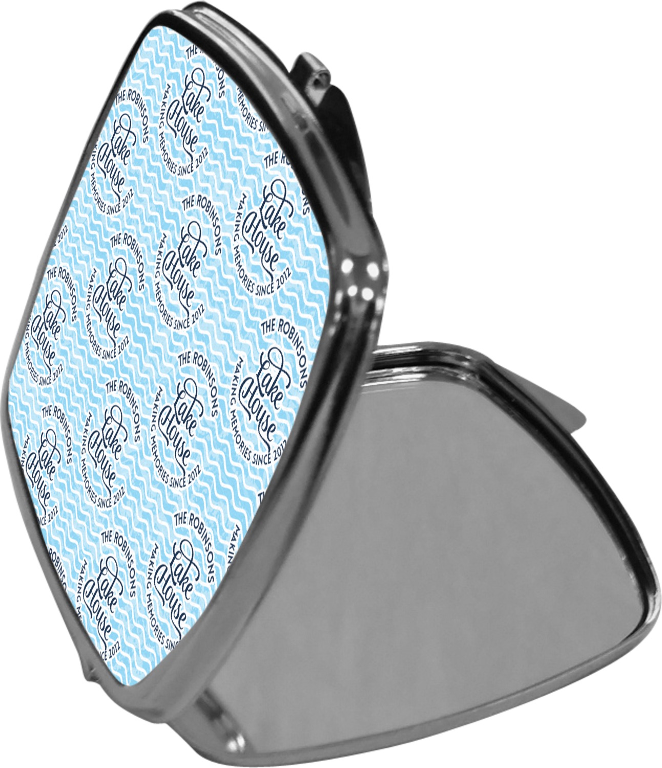 Our compact mirrors are customized with your design on one side. The other side is patterned silver tone metal. Inside, there are two mirrors.