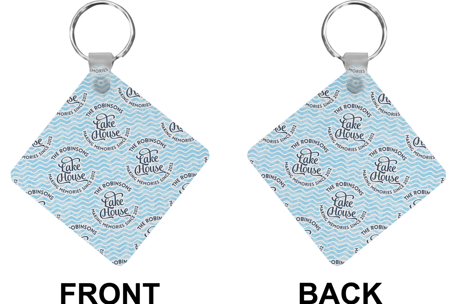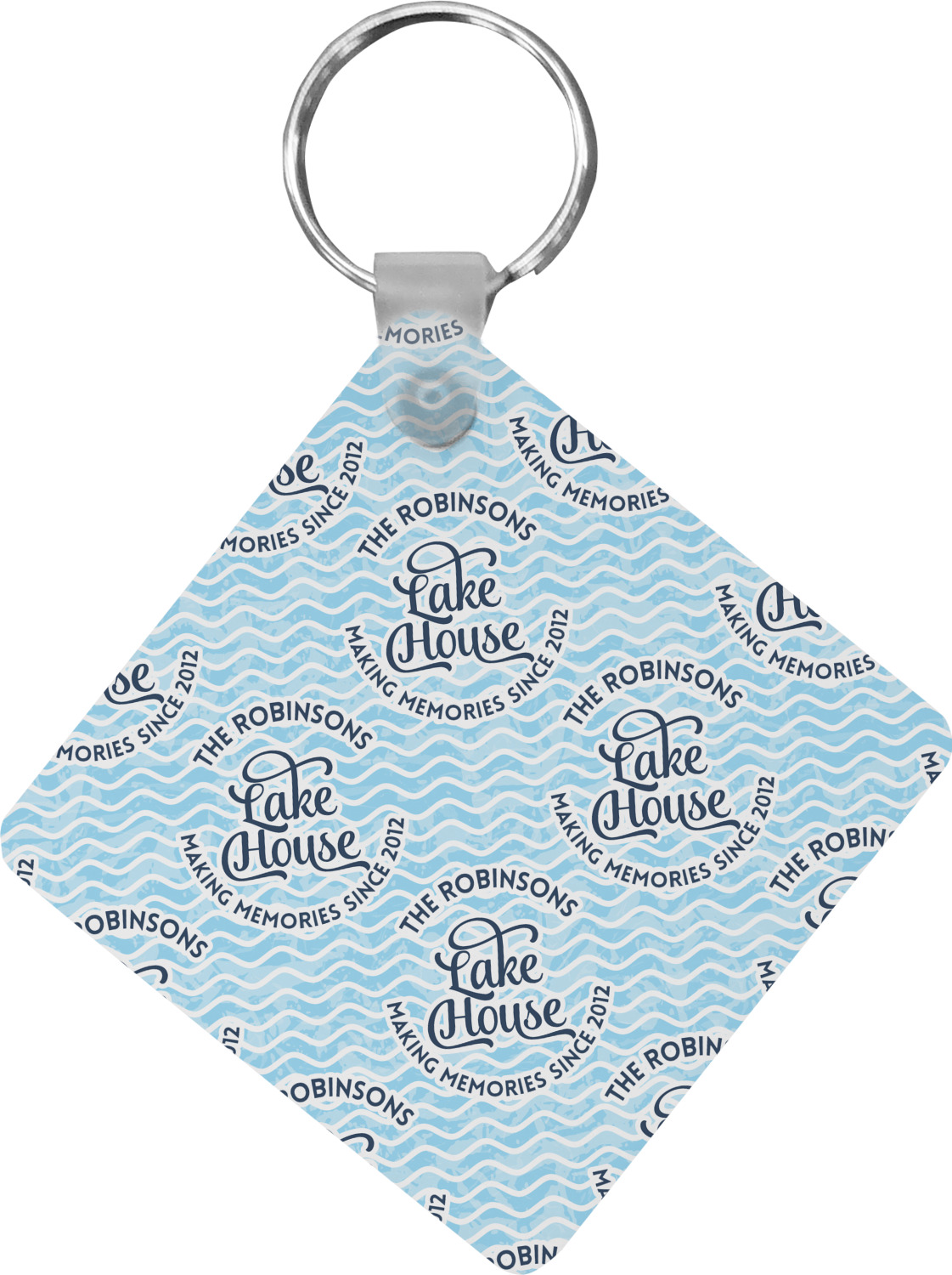 This Lake House Design is serene and calm. We create a "personalized" pattern for this design. The pattern consists of serene blue waves and a round badge that has the words Lake House in the middle. The top text & bottom texts can be customized; we chose to use the family name for the top and instead of using established in 2012, we chose to use the words "Making Memories Since 2012".