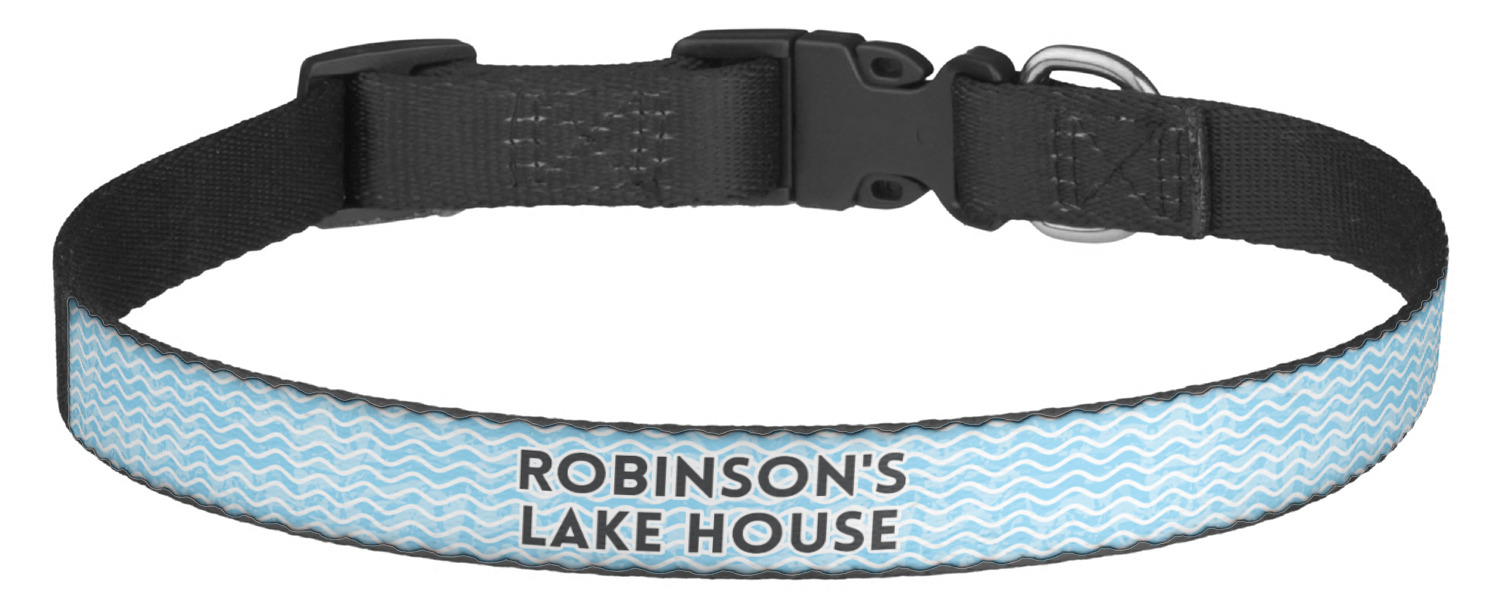 This sturdy collar, made from a durable nylon weave, will outlive your dog's episodes of excited tugging and pulling. Courtesy of its thick plastic buckle and adjuster, this collar is adjustable and accommodating of any dog. Structurally, the collar is a single piece of nylon weave that is sewn together, and features a solid metal loop where you can attach a leash or dog tag. We print and display your dog's name and pattern across the middle of the personalized dog collar.