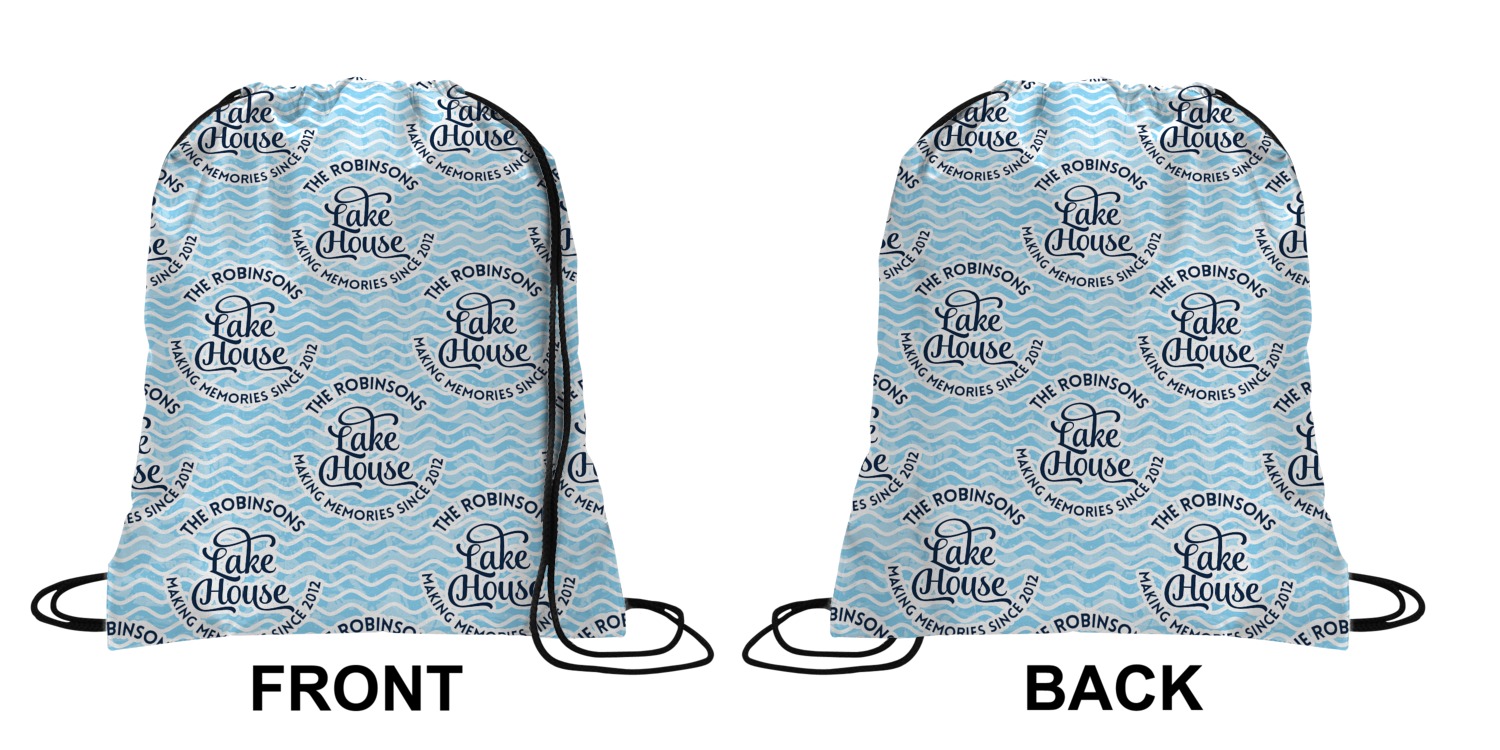 Your custom design will appear on the front and the back of the backpack. You can customize each side individually. The inside of the backpack is white and the drawstrings are black. The back pack is made of 100% polyester fabric.
