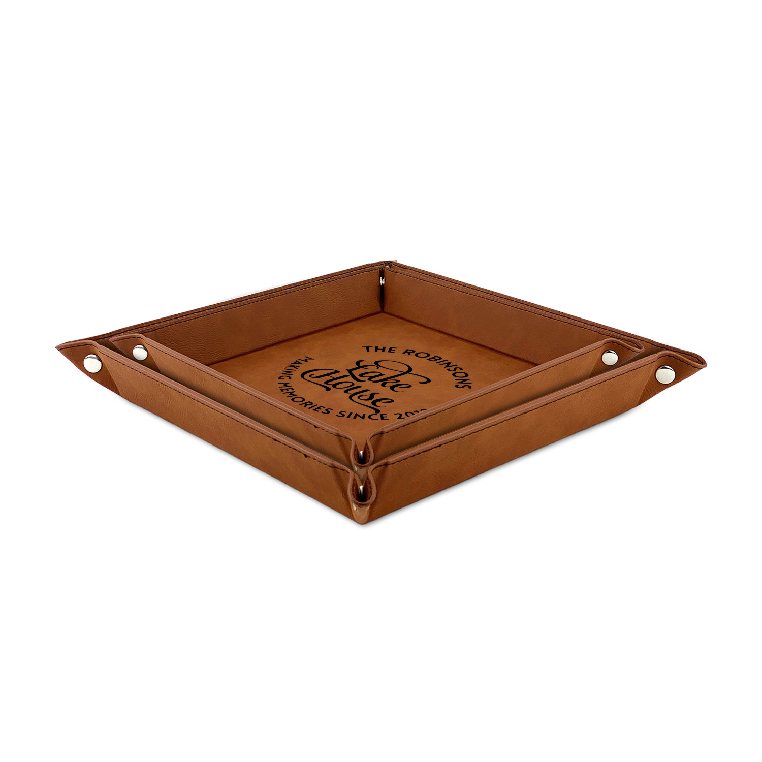 The leatherette wraps the hard board base and sides with flexible hinges to fold the sides up. The corners are secured using silver snaps. The 6in x 6 in tray measures approximately 9.5in x 9.5in when laid flat. The 9in x 9in tray measures approximately 13in x 13in when laid flat.