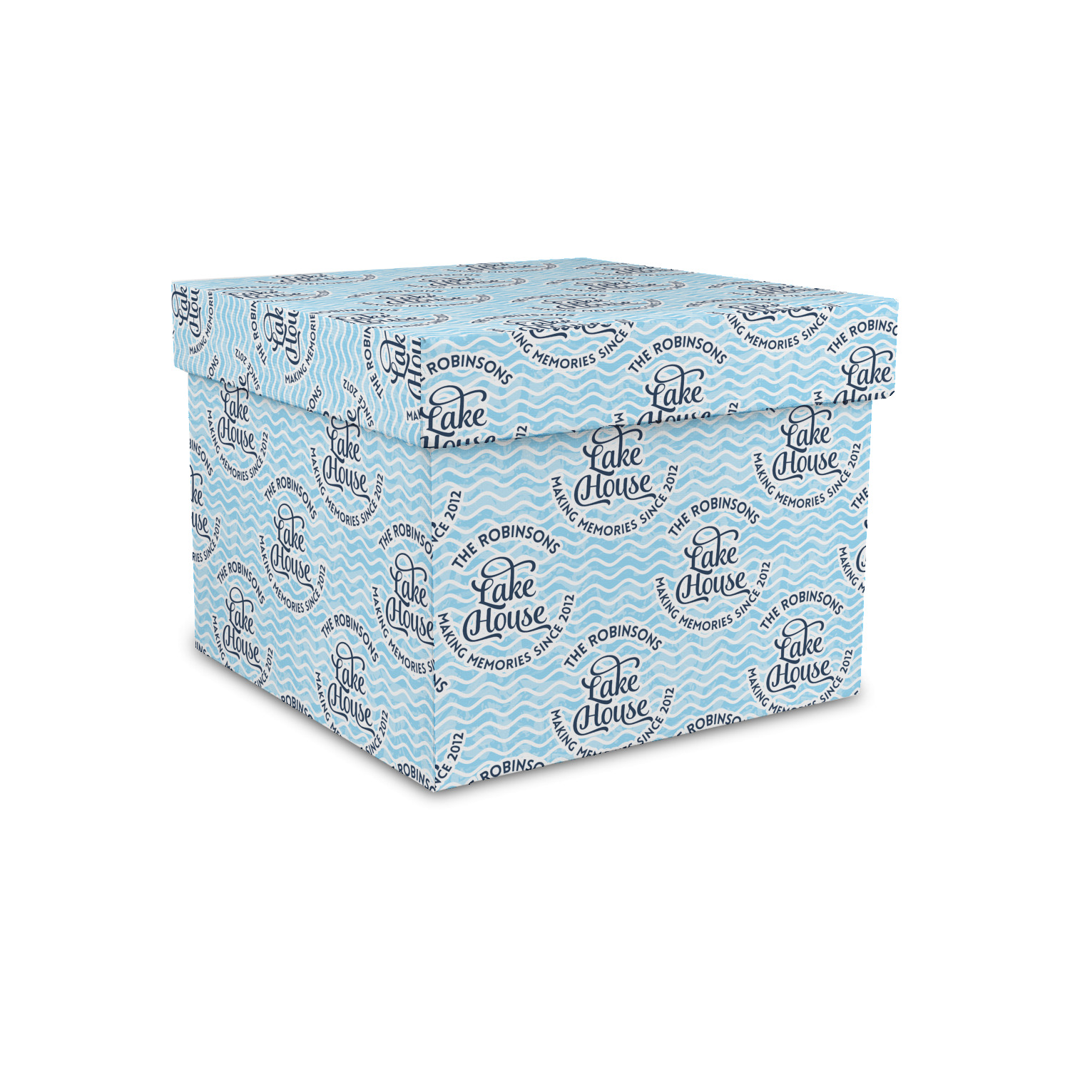 This Lake House Design is serene and calm. We create a "personalized" pattern for this design. The pattern consists of serene blue waves and a round badge that has the words Lake House in the middle. The top text & bottom texts can be customized; we chose to use the family name for the top and instead of using established in 2012, we chose to use the words "Making Memories Since 2012".
