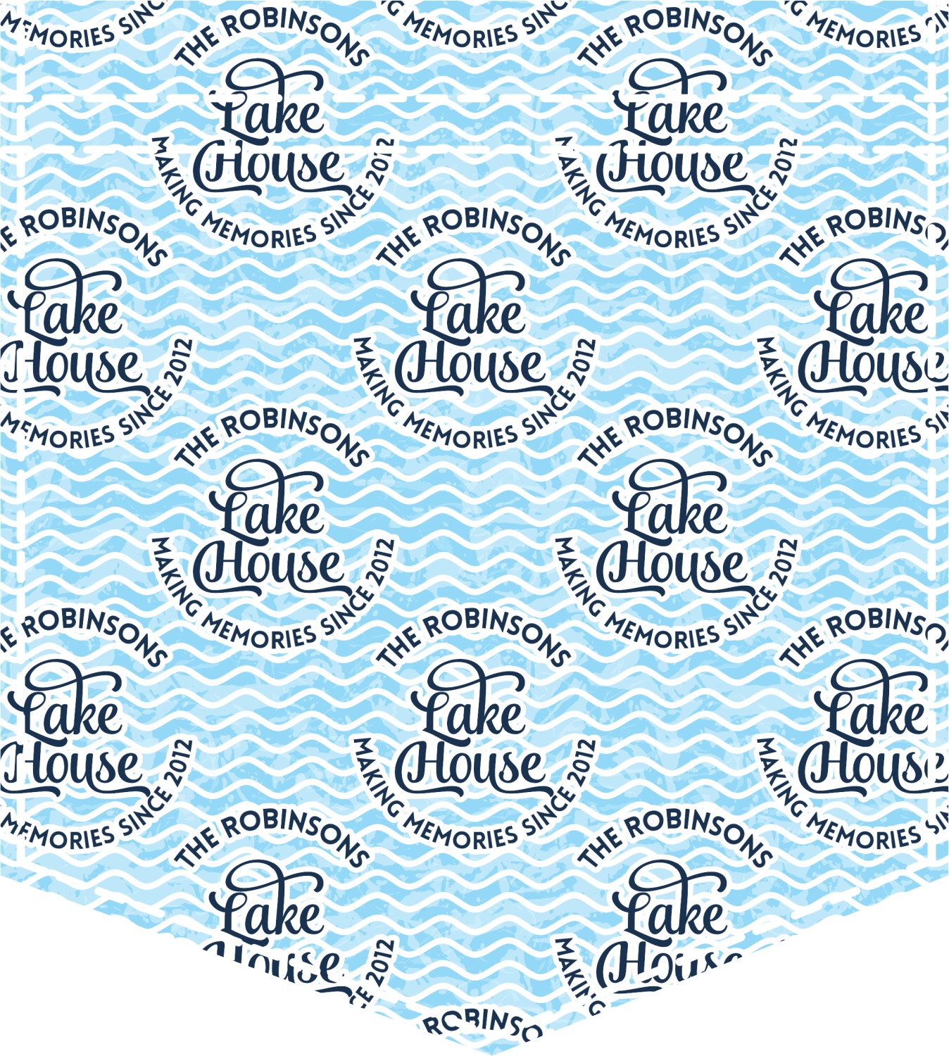 This Lake House Design is serene and calm. We create a "personalized" pattern for this design. The pattern consists of serene blue waves and a round badge that has the words Lake House in the middle. The top text & bottom texts can be customized; we chose to use the family name for the top and instead of using established in 2012, we chose to use the words "Making Memories Since 2012".
