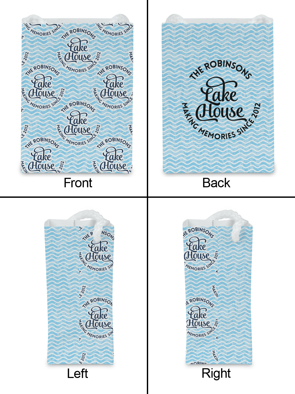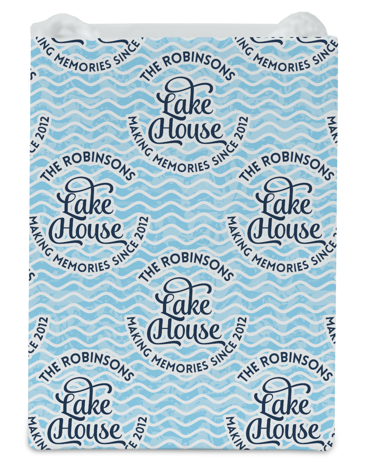This Lake House Design is serene and calm. We create a "personalized" pattern for this design. The pattern consists of serene blue waves and a round badge that has the words Lake House in the middle. The top text & bottom texts can be customized; we chose to use the family name for the top and instead of using established in 2012, we chose to use the words "Making Memories Since 2012".