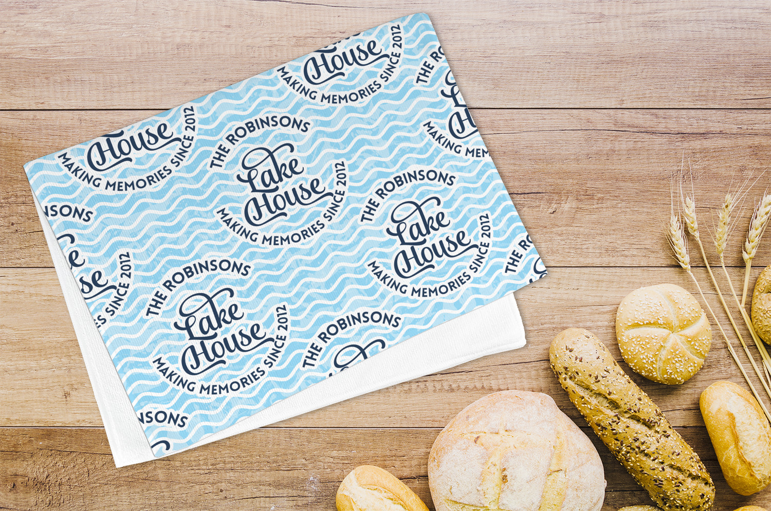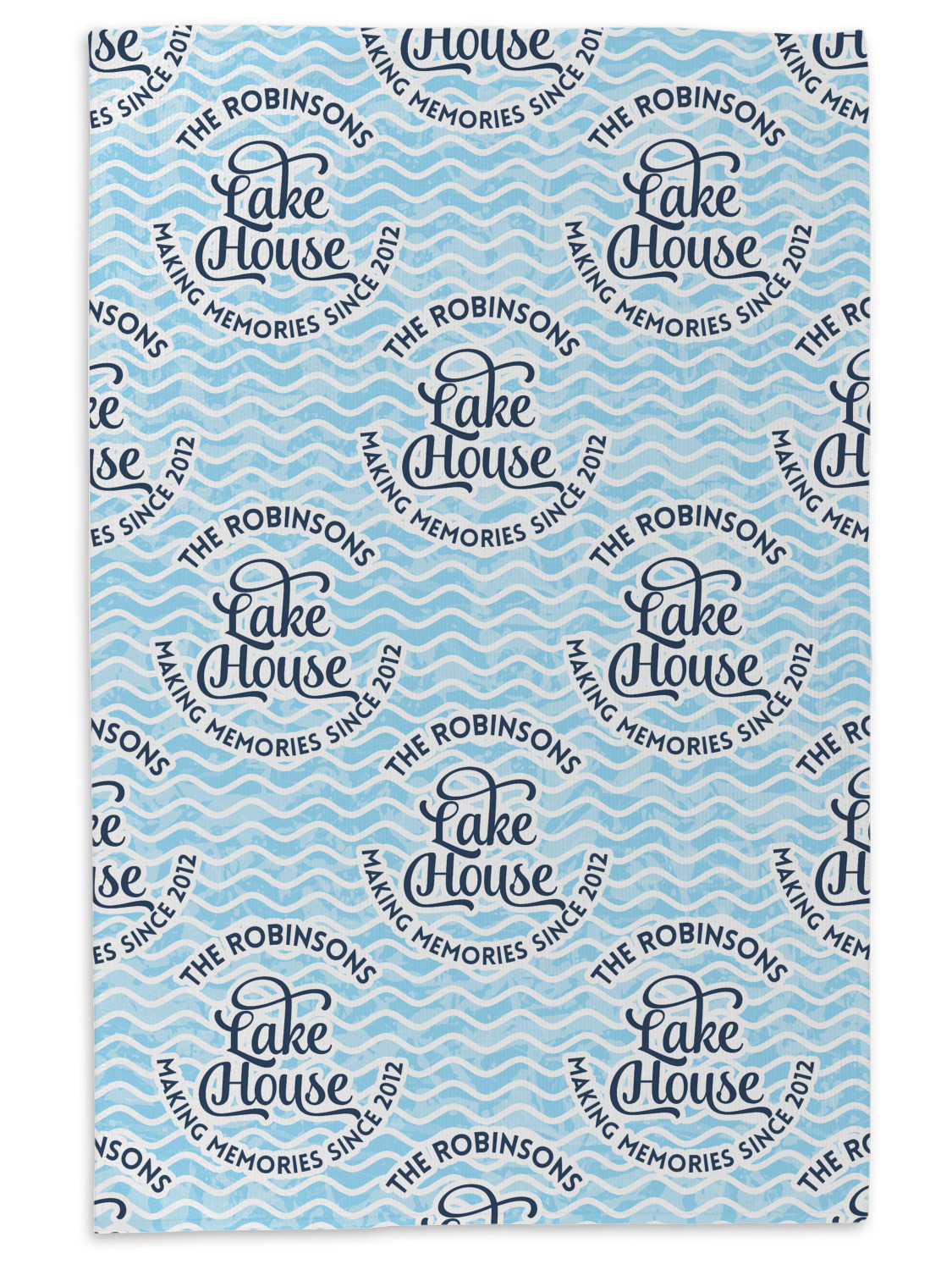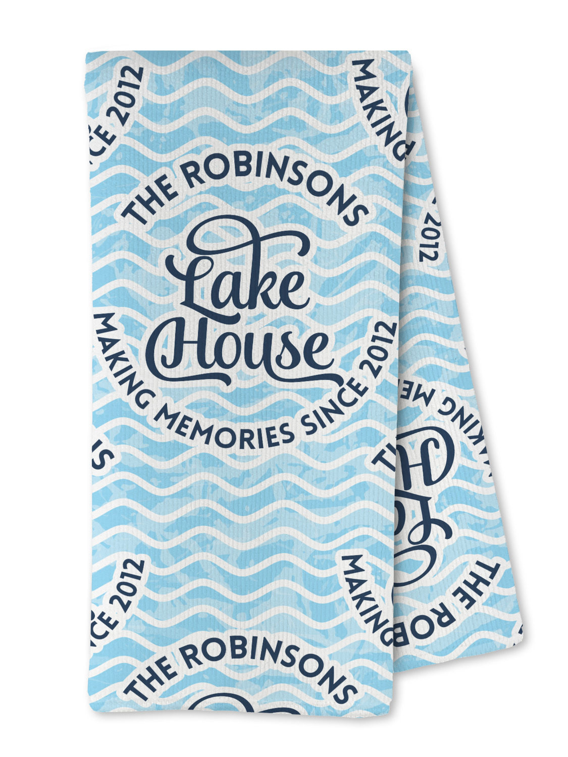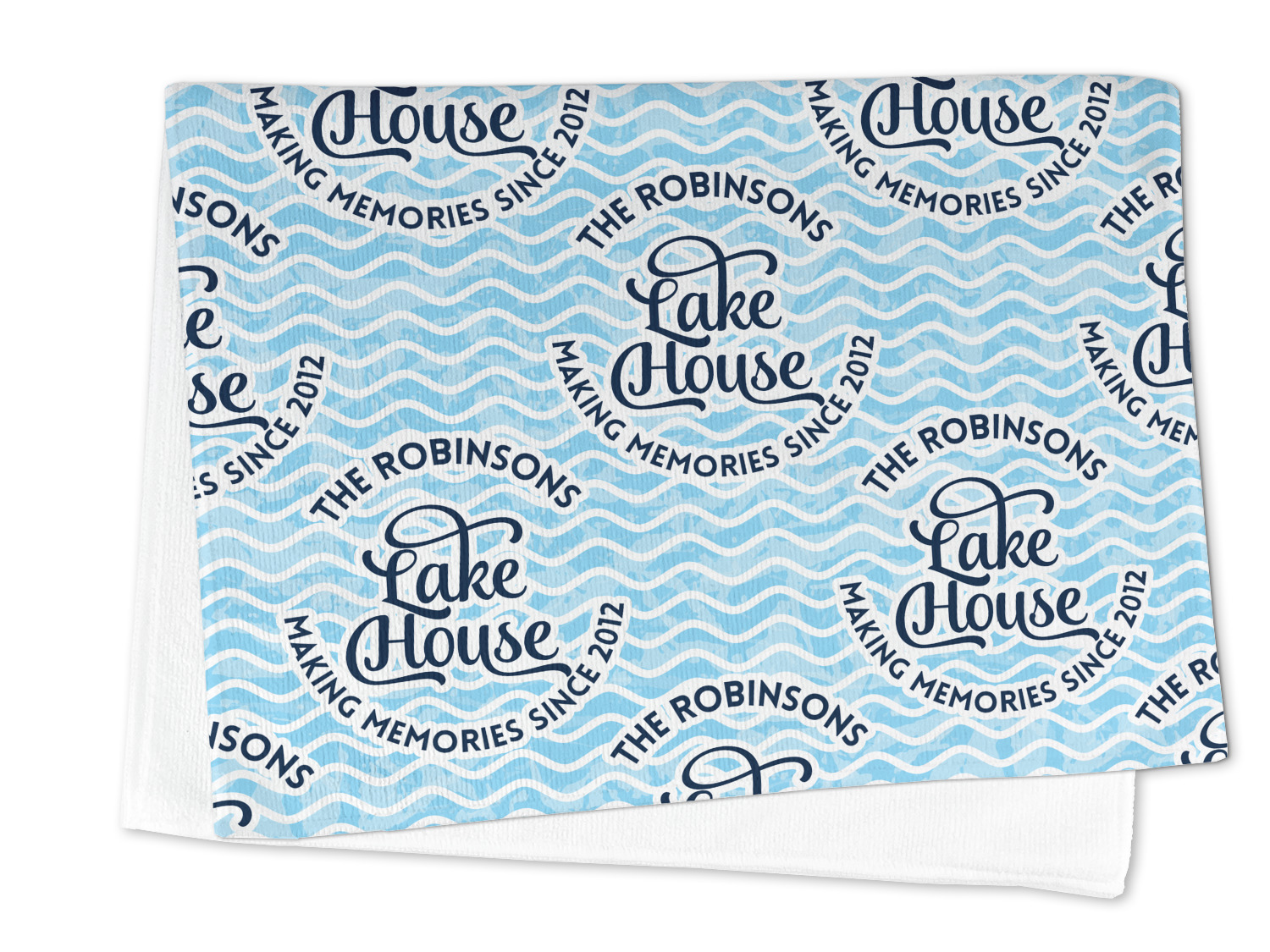 This Lake House Design is serene and calm. We create a "personalized" pattern for this design. The pattern consists of serene blue waves and a round badge that has the words Lake House in the middle. The top text & bottom texts can be customized; we chose to use the family name for the top and instead of using established in 2012, we chose to use the words "Making Memories Since 2012".