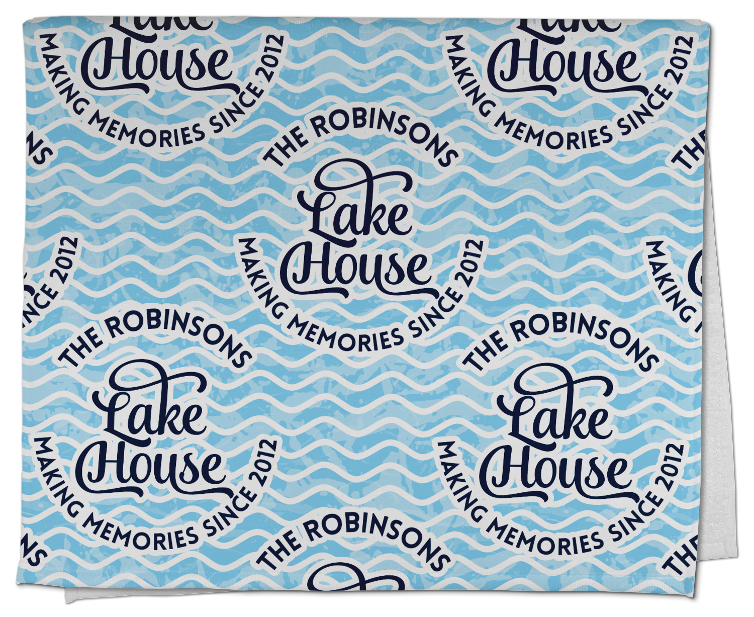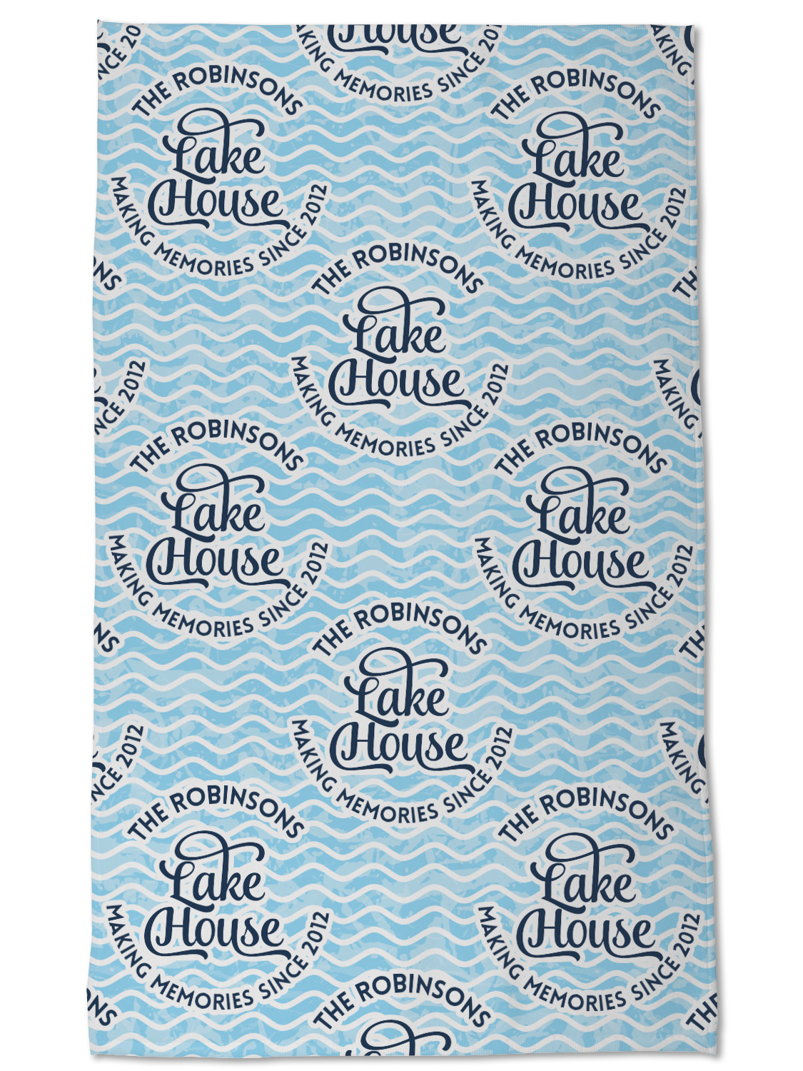 This Lake House Design is serene and calm. We create a "personalized" pattern for this design. The pattern consists of serene blue waves and a round badge that has the words Lake House in the middle. The top text & bottom texts can be customized; we chose to use the family name for the top and instead of using established in 2012, we chose to use the words "Making Memories Since 2012".