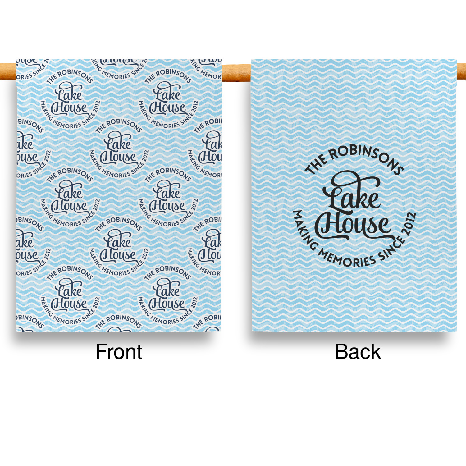 These custom garden flags are made of a durable, double-ply, polyester weave, allowing them to withstand the elements year round. The small flags measure at approximately 12 by 18 inches. The large flags measure out to 28 by 37 inches. You can order these decorative flags with your customization printed on the front only, or the front and back.