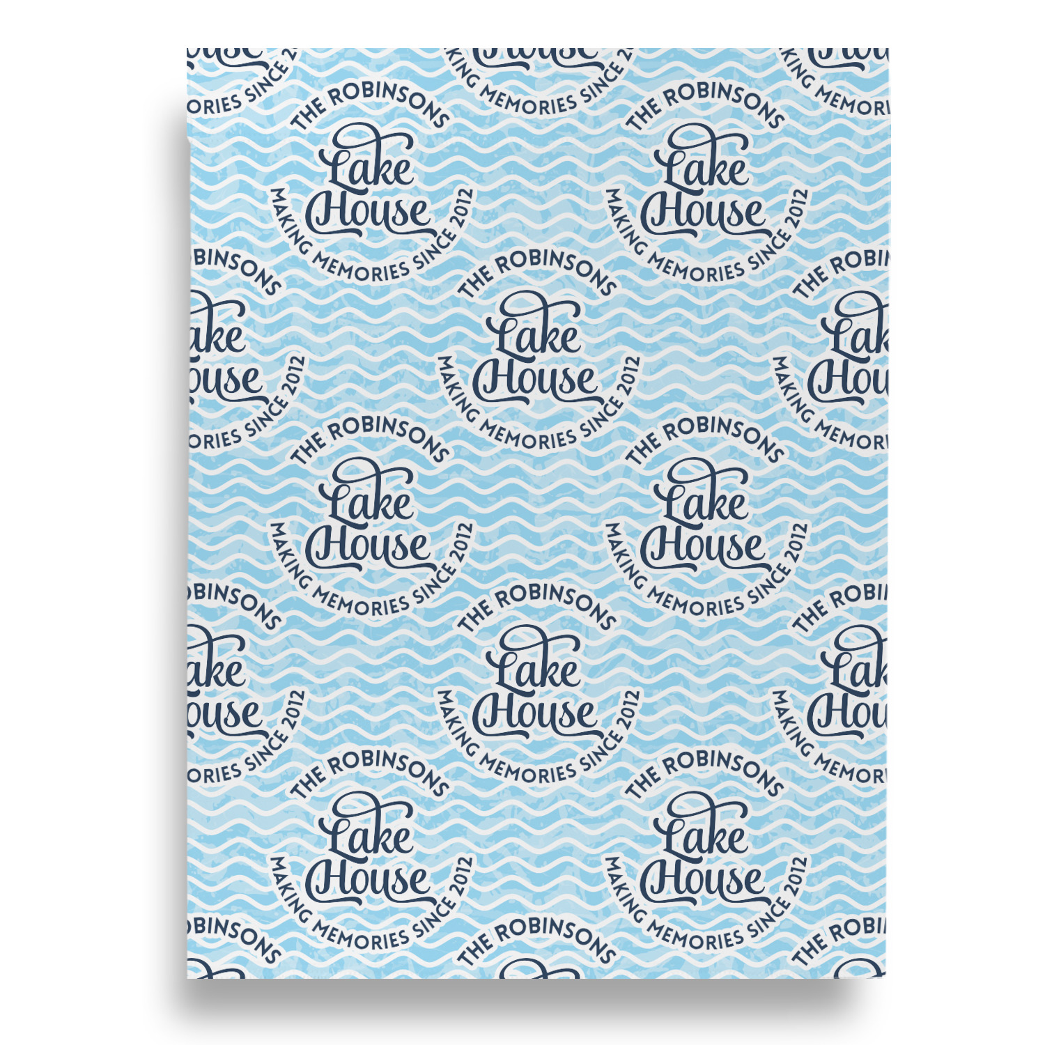 This Lake House Design is serene and calm. We create a "personalized" pattern for this design. The pattern consists of serene blue waves and a round badge that has the words Lake House in the middle. The top text & bottom texts can be customized; we chose to use the family name for the top and instead of using established in 2012, we chose to use the words "Making Memories Since 2012".