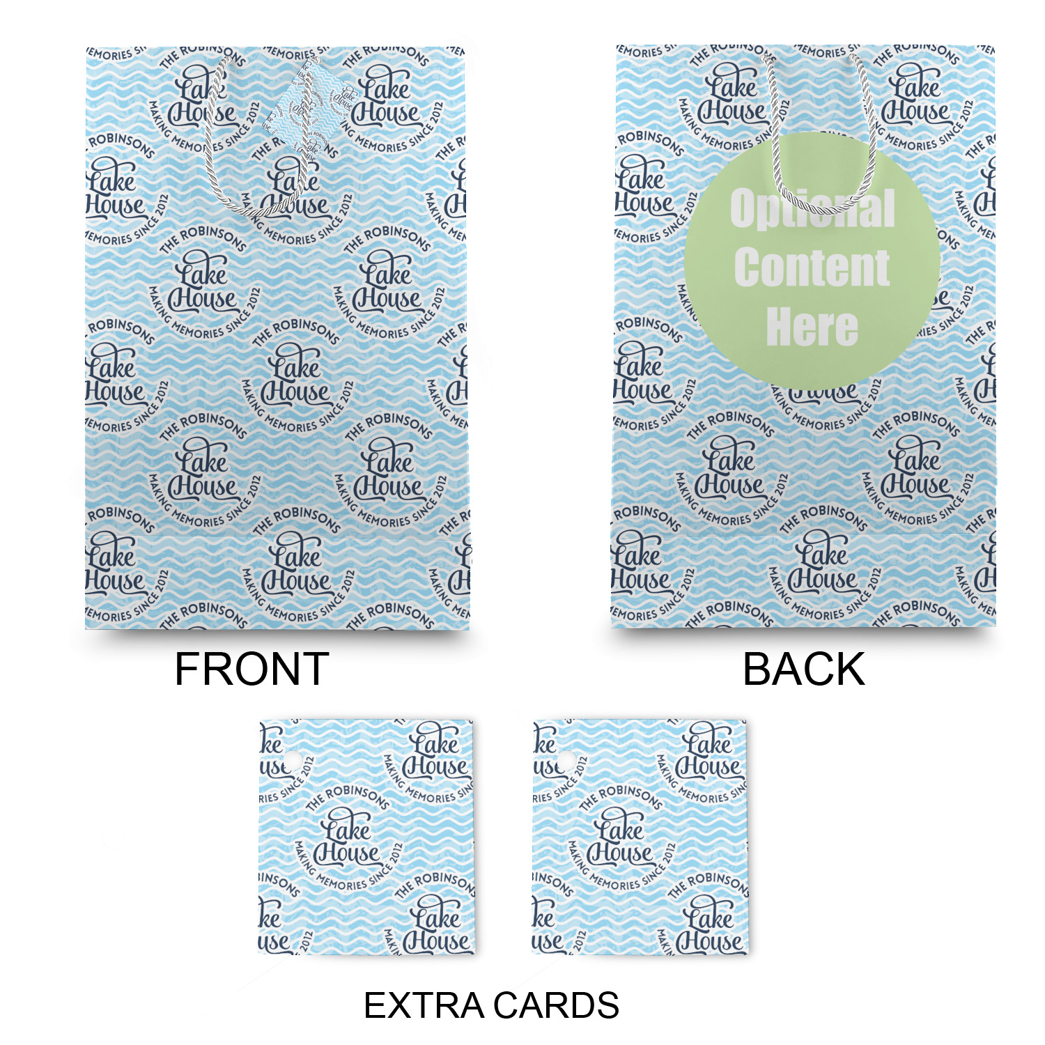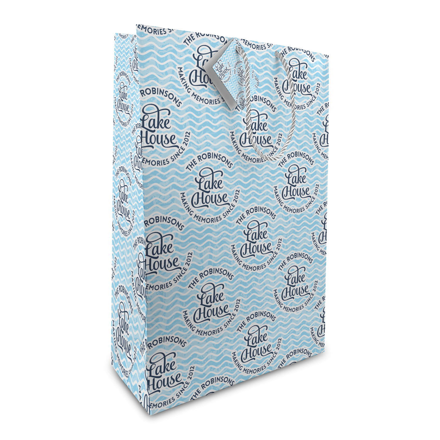 This Lake House Design is serene and calm. We create a "personalized" pattern for this design. The pattern consists of serene blue waves and a round badge that has the words Lake House in the middle. The top text & bottom texts can be customized; we chose to use the family name for the top and instead of using established in 2012, we chose to use the words "Making Memories Since 2012".