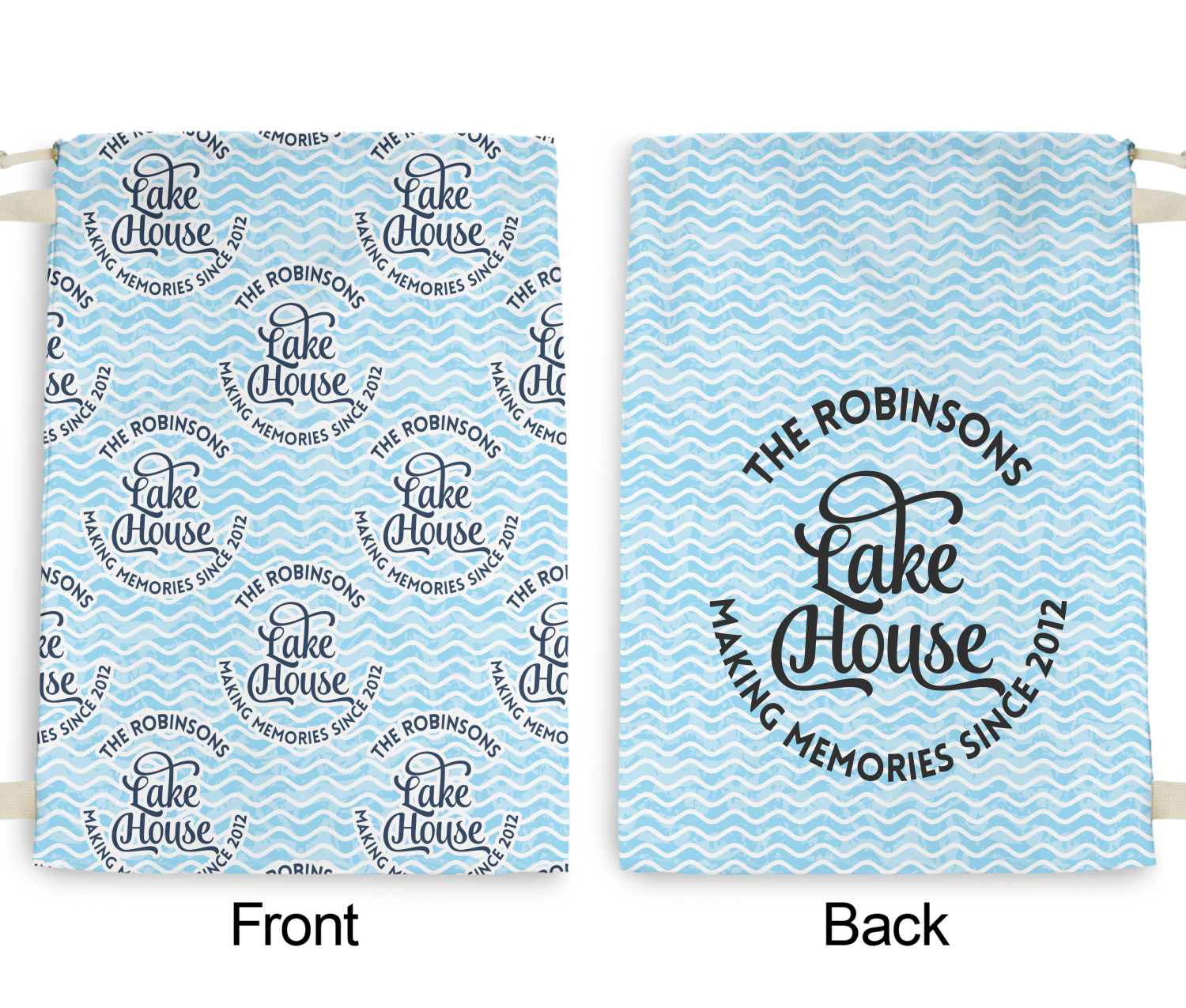 This Lake House Design is serene and calm. We create a "personalized" pattern for this design. The pattern consists of serene blue waves and a round badge that has the words Lake House in the middle. The top text & bottom texts can be customized; we chose to use the family name for the top and instead of using established in 2012, we chose to use the words "Making Memories Since 2012".