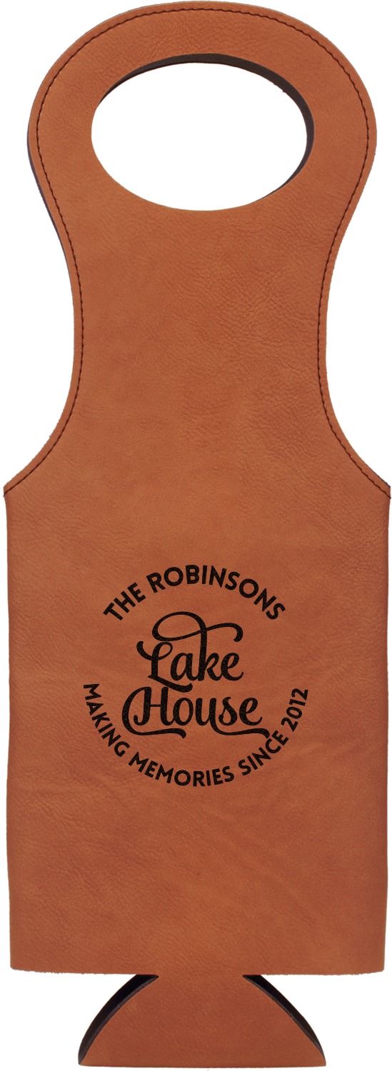This wine carrier is made from a stunning leatherette, in a cognac-brown color. Strong, black stitching lines the sides of your wine bottle bag and provides extra durability. The interior is lined with a padded, black material to allow for a snug fit once your bottle is placed inside. At the top of this wine gift bag, you'll find two oval shaped handles that elegantly complements the rest of the bag's style. We provide you with the option of laser-engraving the front, or the front and back of your new personalized wine bag!