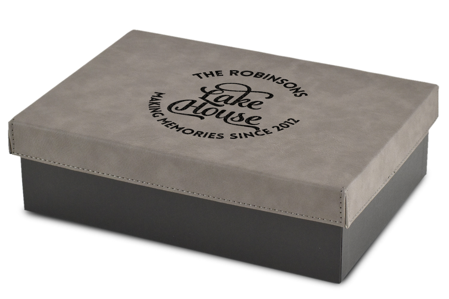 These gift boxes are available in 3 different sizes to accommodate various sized gifts. Available in gray as a neutral color for any occasion as well as to showcase your design boldly. Engraved with a laser this high quality paper board and faux leather gift box is unique and makes any gift stand out.