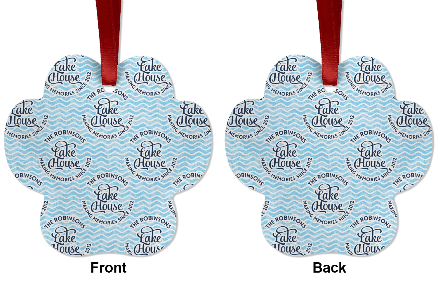 This Lake House Design is serene and calm. We create a "personalized" pattern for this design. The pattern consists of serene blue waves and a round badge that has the words Lake House in the middle. The top text & bottom texts can be customized; we chose to use the family name for the top and instead of using established in 2012, we chose to use the words "Making Memories Since 2012".