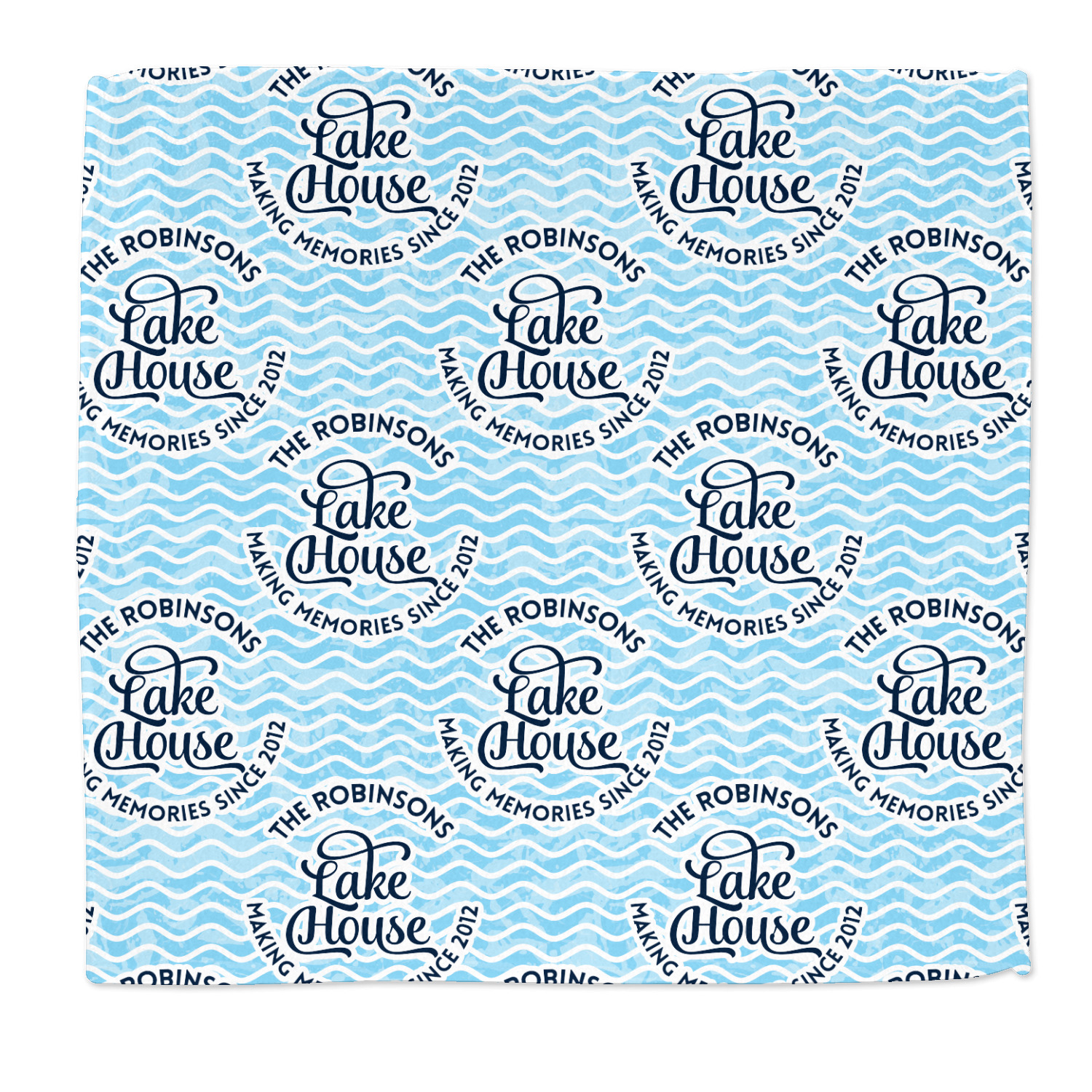 This Lake House Design is serene and calm. We create a "personalized" pattern for this design. The pattern consists of serene blue waves and a round badge that has the words Lake House in the middle. The top text & bottom texts can be customized; we chose to use the family name for the top and instead of using established in 2012, we chose to use the words "Making Memories Since 2012".