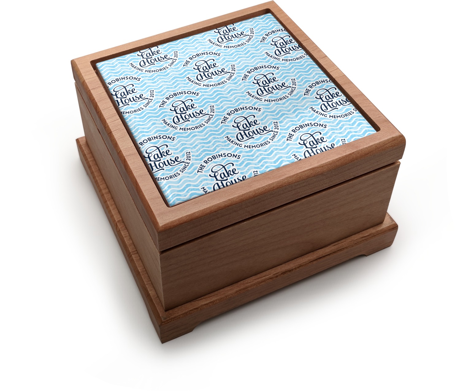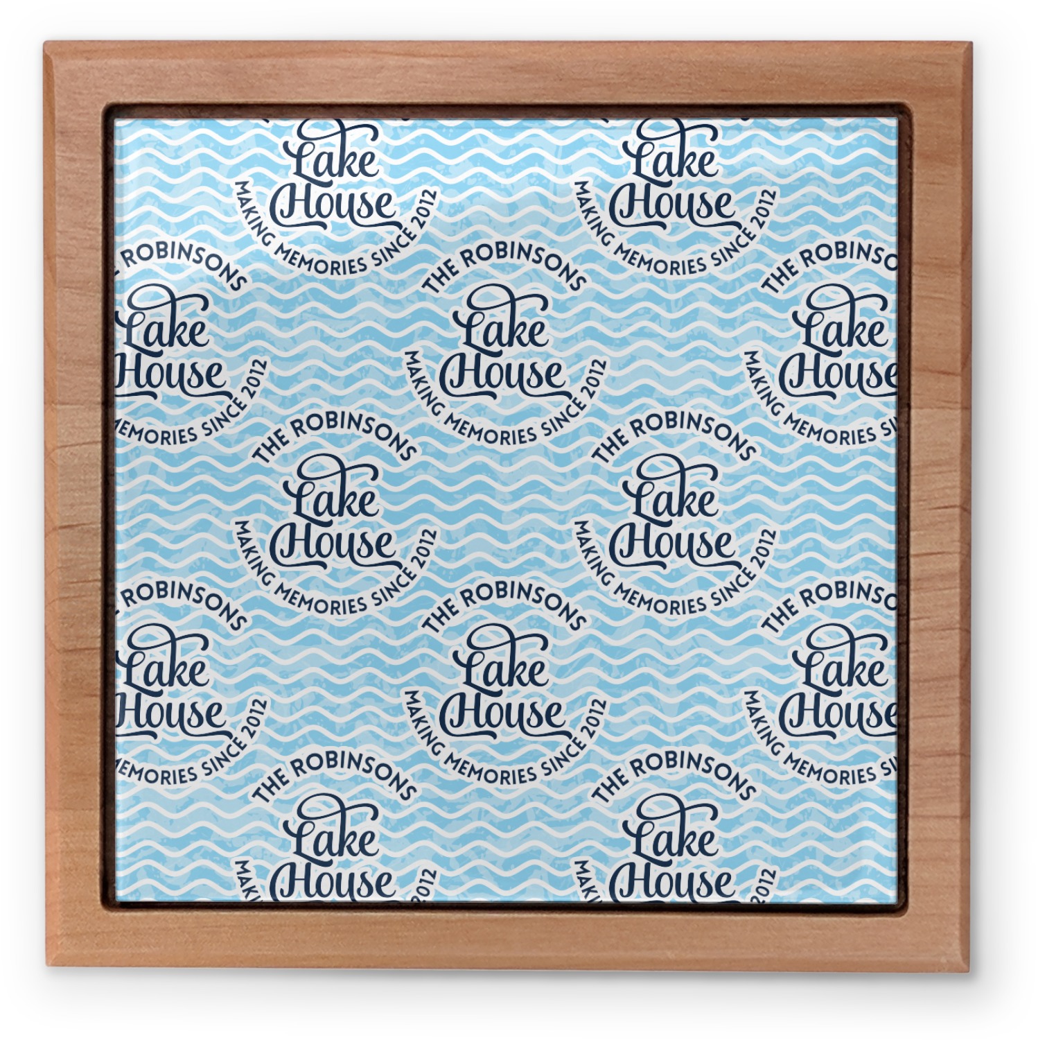 This Lake House Design is serene and calm. We create a "personalized" pattern for this design. The pattern consists of serene blue waves and a round badge that has the words Lake House in the middle. The top text & bottom texts can be customized; we chose to use the family name for the top and instead of using established in 2012, we chose to use the words "Making Memories Since 2012".