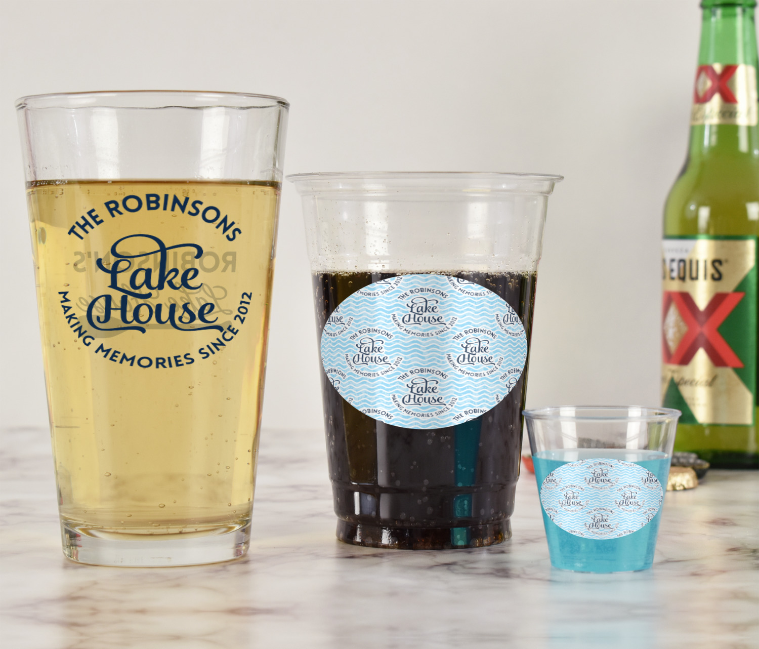 This Lake House Design is serene and calm. We create a "personalized" pattern for this design. The pattern consists of serene blue waves and a round badge that has the words Lake House in the middle. The top text & bottom texts can be customized; we chose to use the family name for the top and instead of using established in 2012, we chose to use the words "Making Memories Since 2012".
