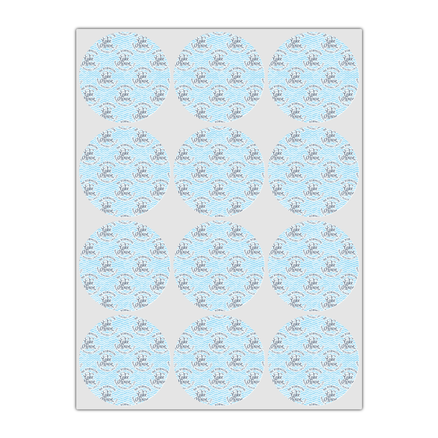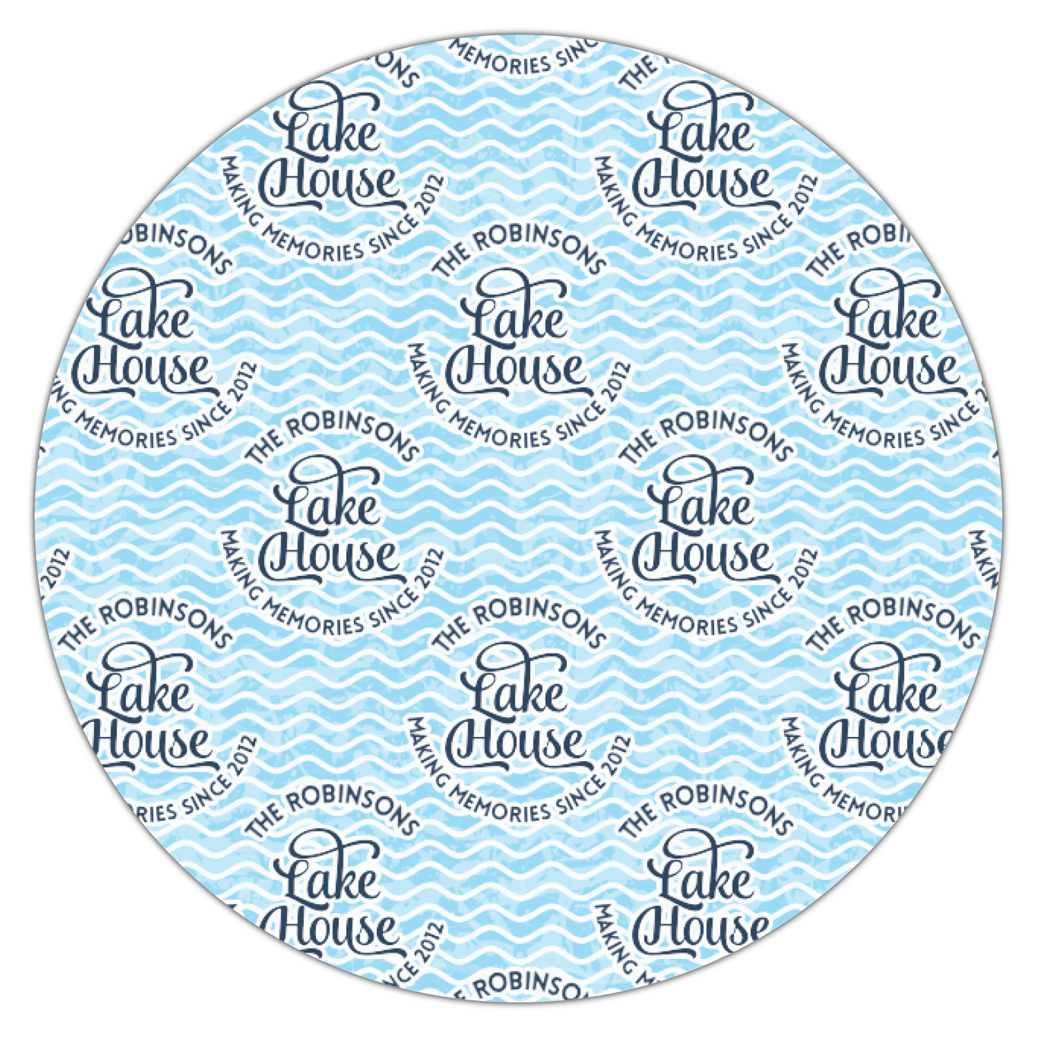 This Lake House Design is serene and calm. We create a "personalized" pattern for this design. The pattern consists of serene blue waves and a round badge that has the words Lake House in the middle. The top text & bottom texts can be customized; we chose to use the family name for the top and instead of using established in 2012, we chose to use the words "Making Memories Since 2012".