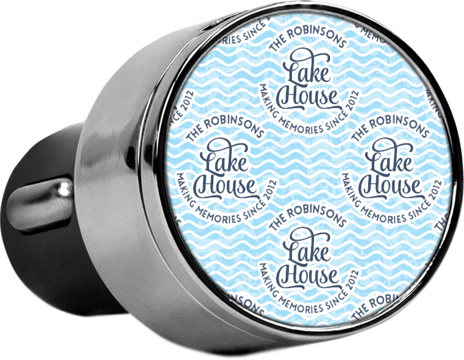 This Lake House Design is serene and calm. We create a "personalized" pattern for this design. The pattern consists of serene blue waves and a round badge that has the words Lake House in the middle. The top text & bottom texts can be customized; we chose to use the family name for the top and instead of using established in 2012, we chose to use the words "Making Memories Since 2012".