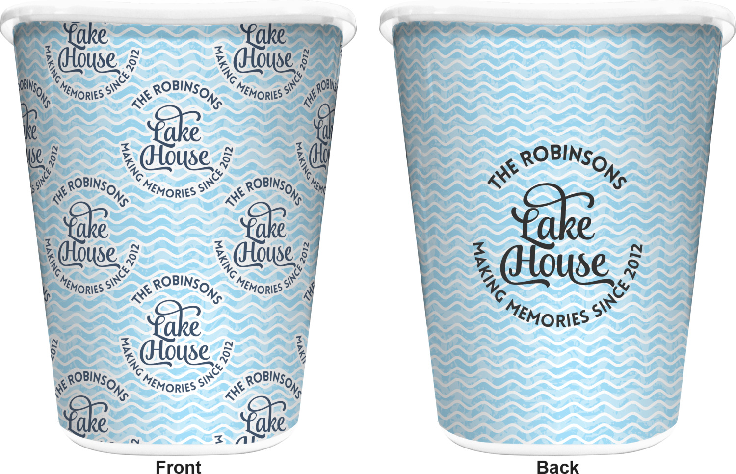 This Lake House Design is serene and calm. We create a "personalized" pattern for this design. The pattern consists of serene blue waves and a round badge that has the words Lake House in the middle. The top text & bottom texts can be customized; we chose to use the family name for the top and instead of using established in 2012, we chose to use the words "Making Memories Since 2012".