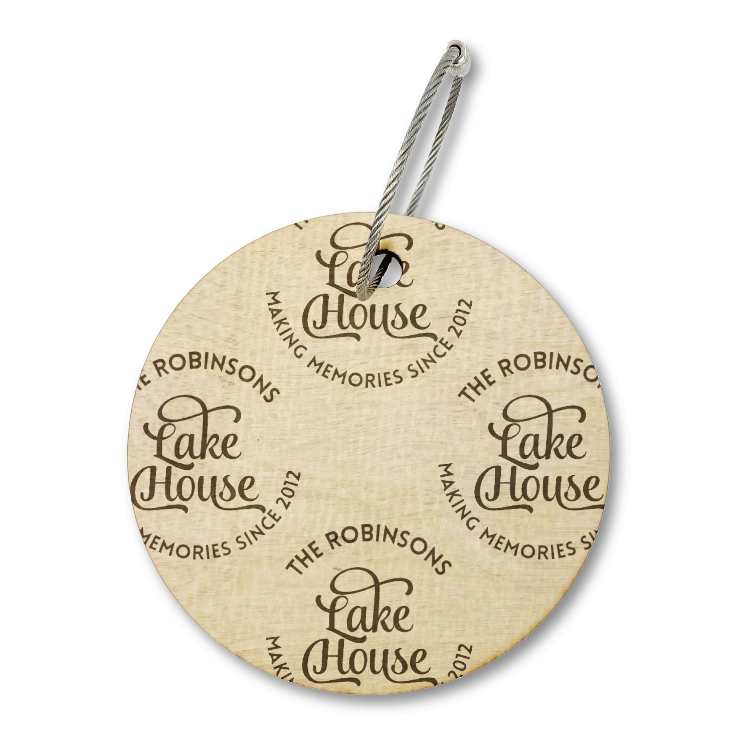 This Lake House Design is serene and calm. We create a "personalized" pattern for this design. The pattern consists of serene blue waves and a round badge that has the words Lake House in the middle. The top text & bottom texts can be customized; we chose to use the family name for the top and instead of using established in 2012, we chose to use the words "Making Memories Since 2012".