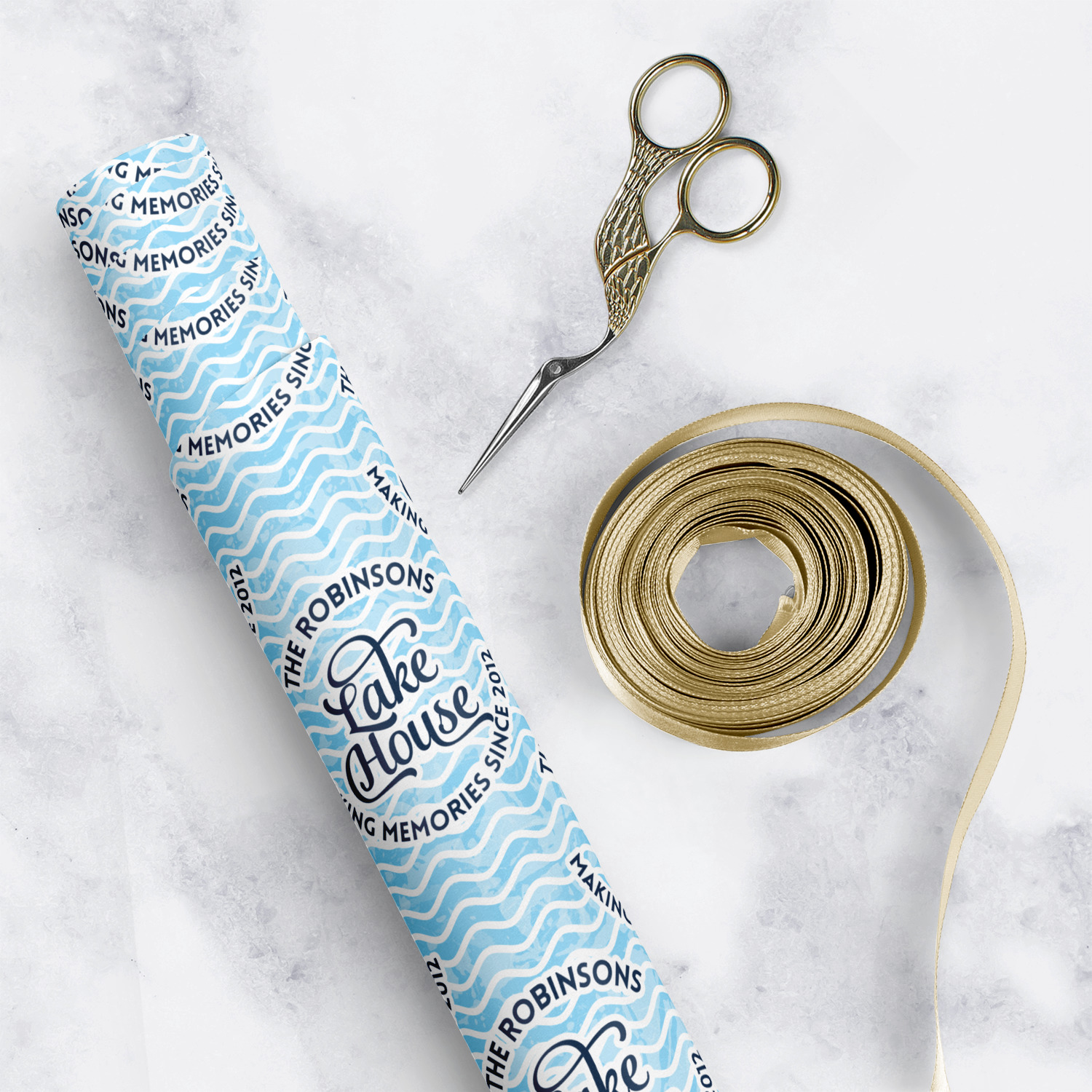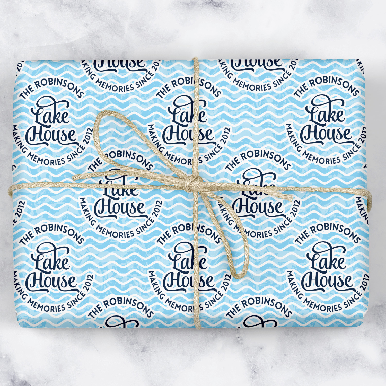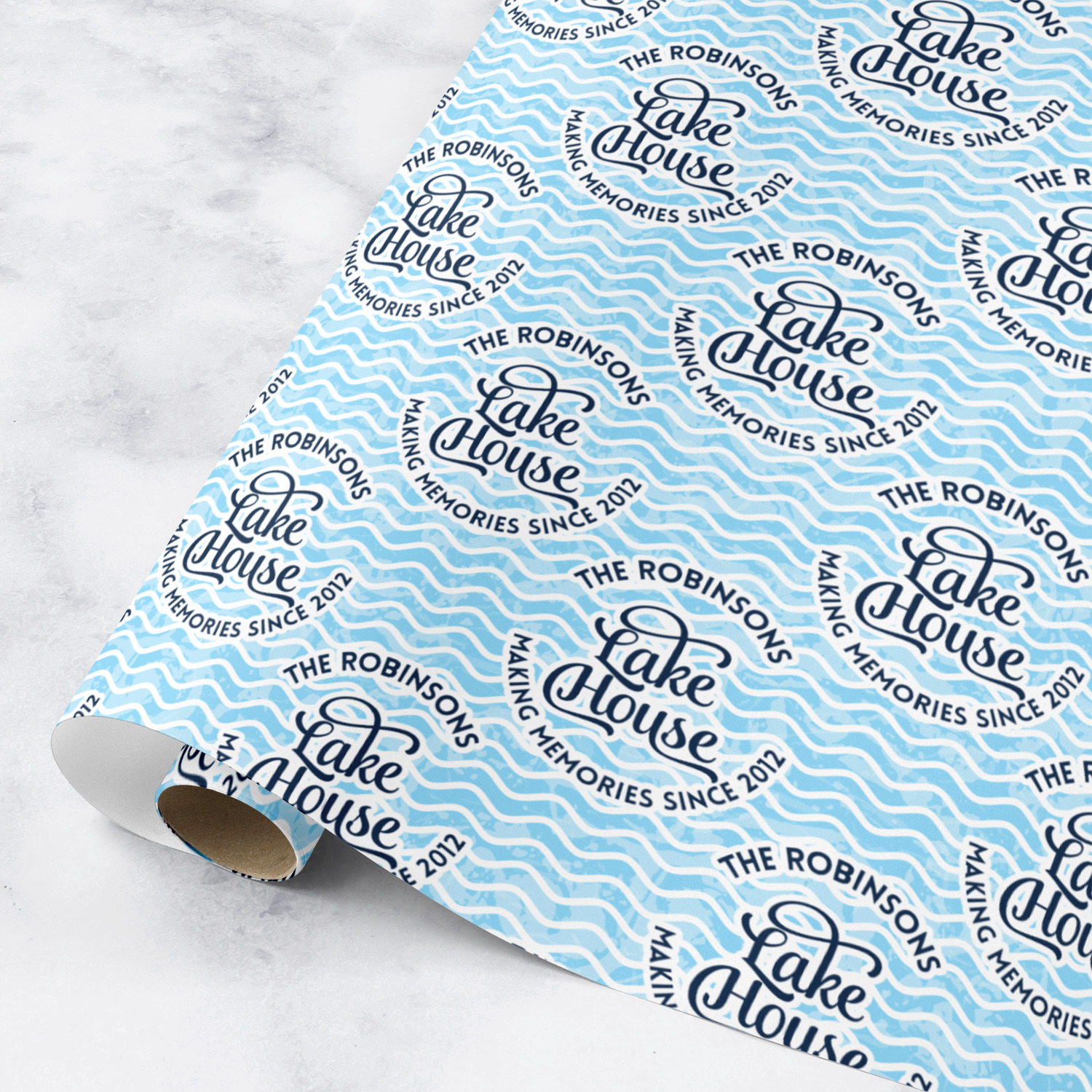 This Lake House Design is serene and calm. We create a "personalized" pattern for this design. The pattern consists of serene blue waves and a round badge that has the words Lake House in the middle. The top text & bottom texts can be customized; we chose to use the family name for the top and instead of using established in 2012, we chose to use the words "Making Memories Since 2012".