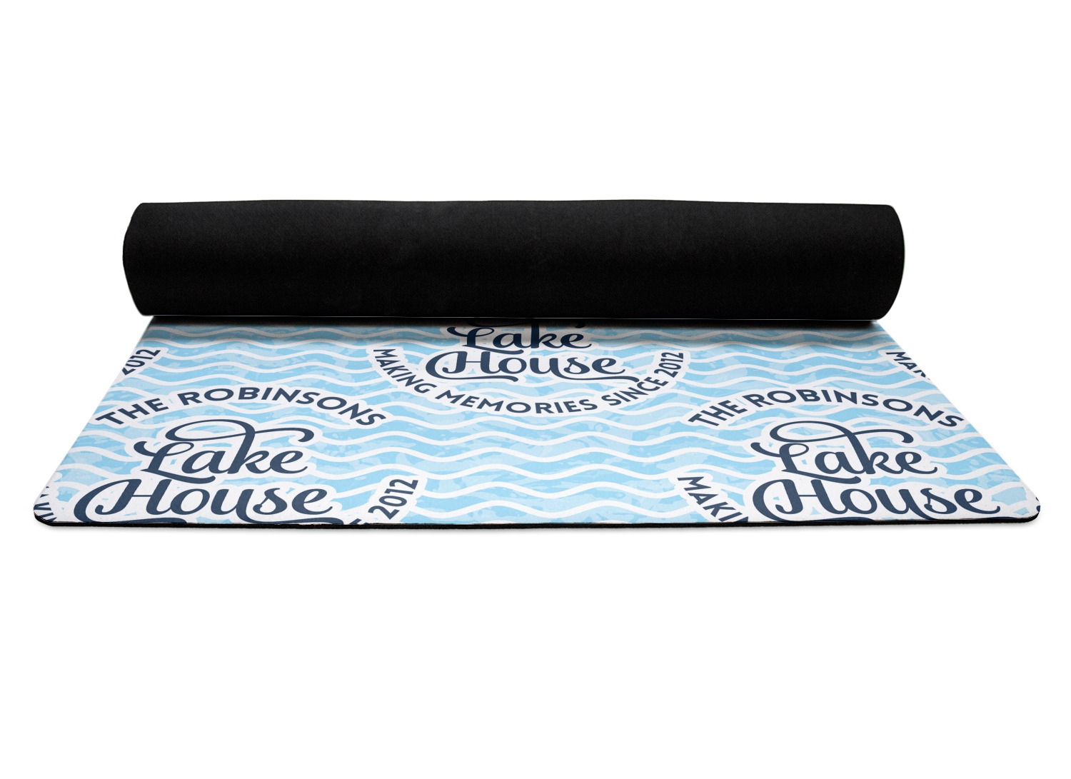 The top of the mats are dyed with your design using eco friendly non solvent inks. They have a smooth fleece felt top and feels very soft. The back of the mat is a sleek black and is a squishy non-slip texture to ensure that your mat does not slip on the floor. Our rubber backed mats are the perfect size at 68" x 24" and are just under approximately 1/4 inch thickness.
