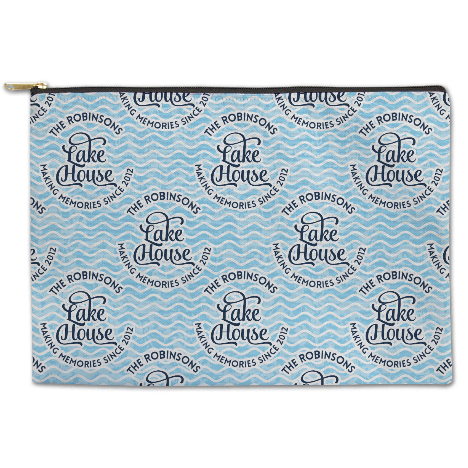Our zippered pouches are available in two sizes - small: approx 8.5W"x6H and large: approx 12.5Wx8.5H. The pouches are made from a soft & durable canvas fabric that is printed on the outside with your design; the inside has a fused black lining. The printed canvas fabric is then cut and the pouches are sewn right here in the USA. The zipper itself is gold in color and has a round hook.
