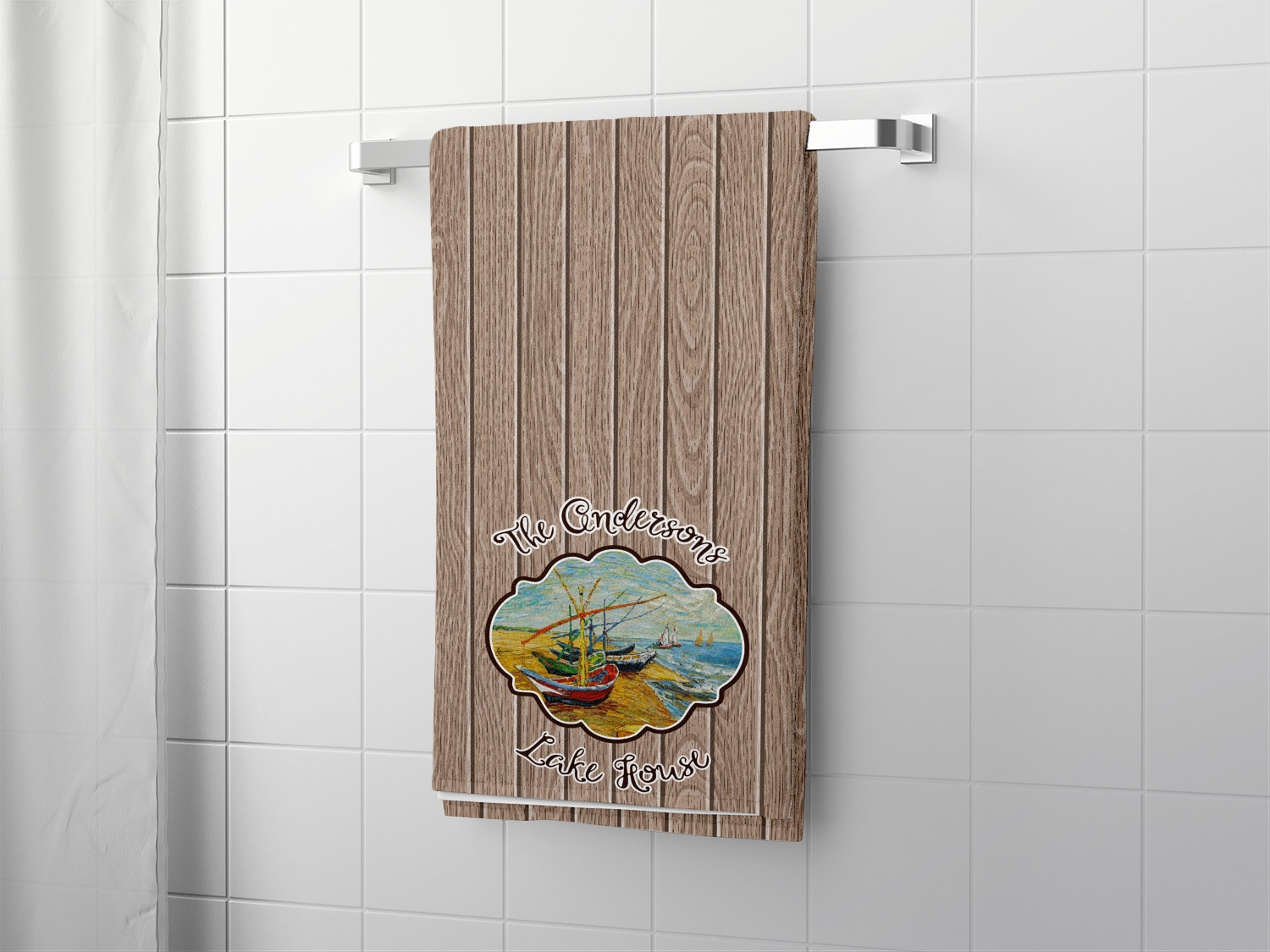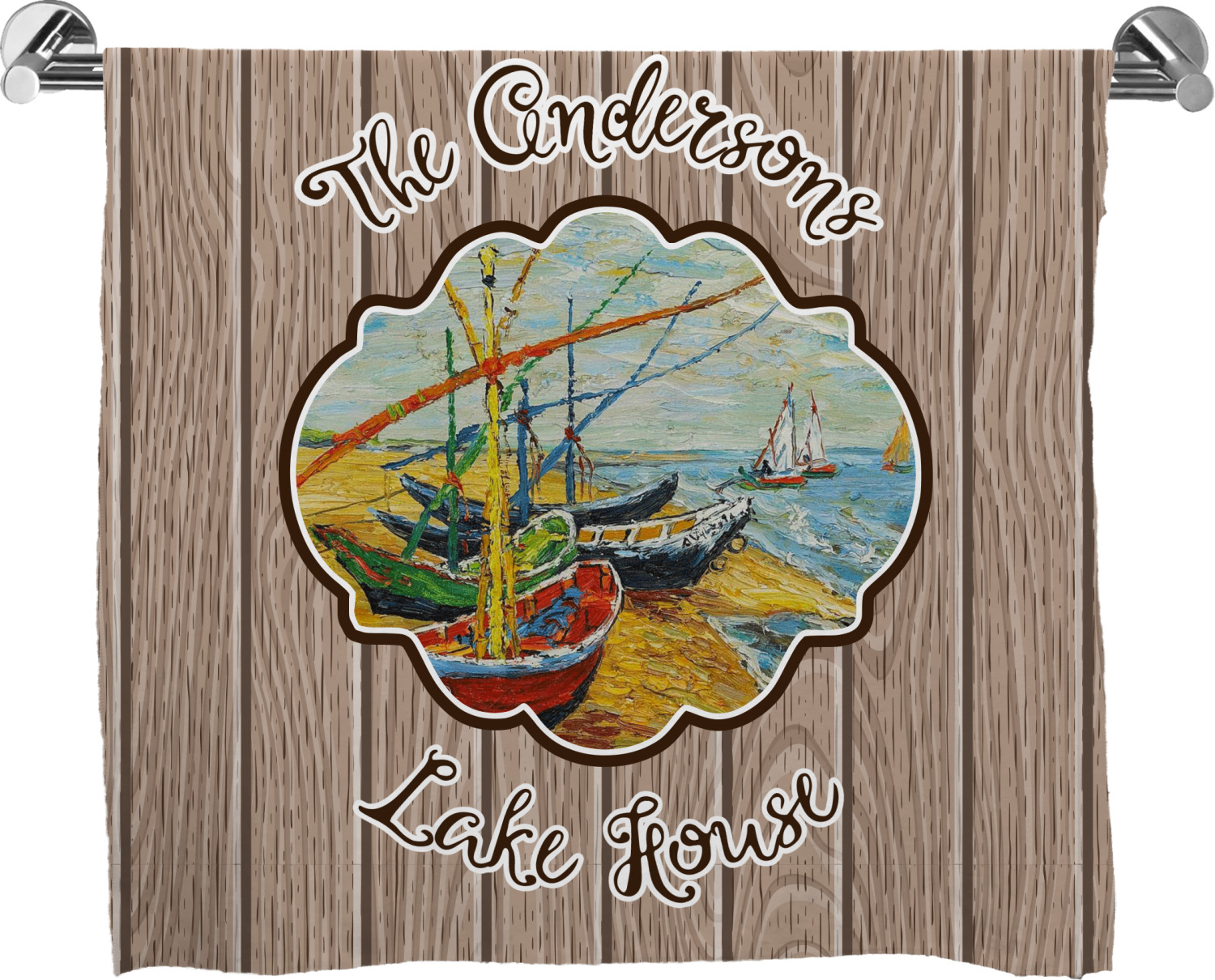 These customized bath towels are slightly larger than your standard towel and are the ideal size for wrapping around your body. They measure approximately 60" x 30". Your customization is displayed across the entire front face of the towel, while the back is white.