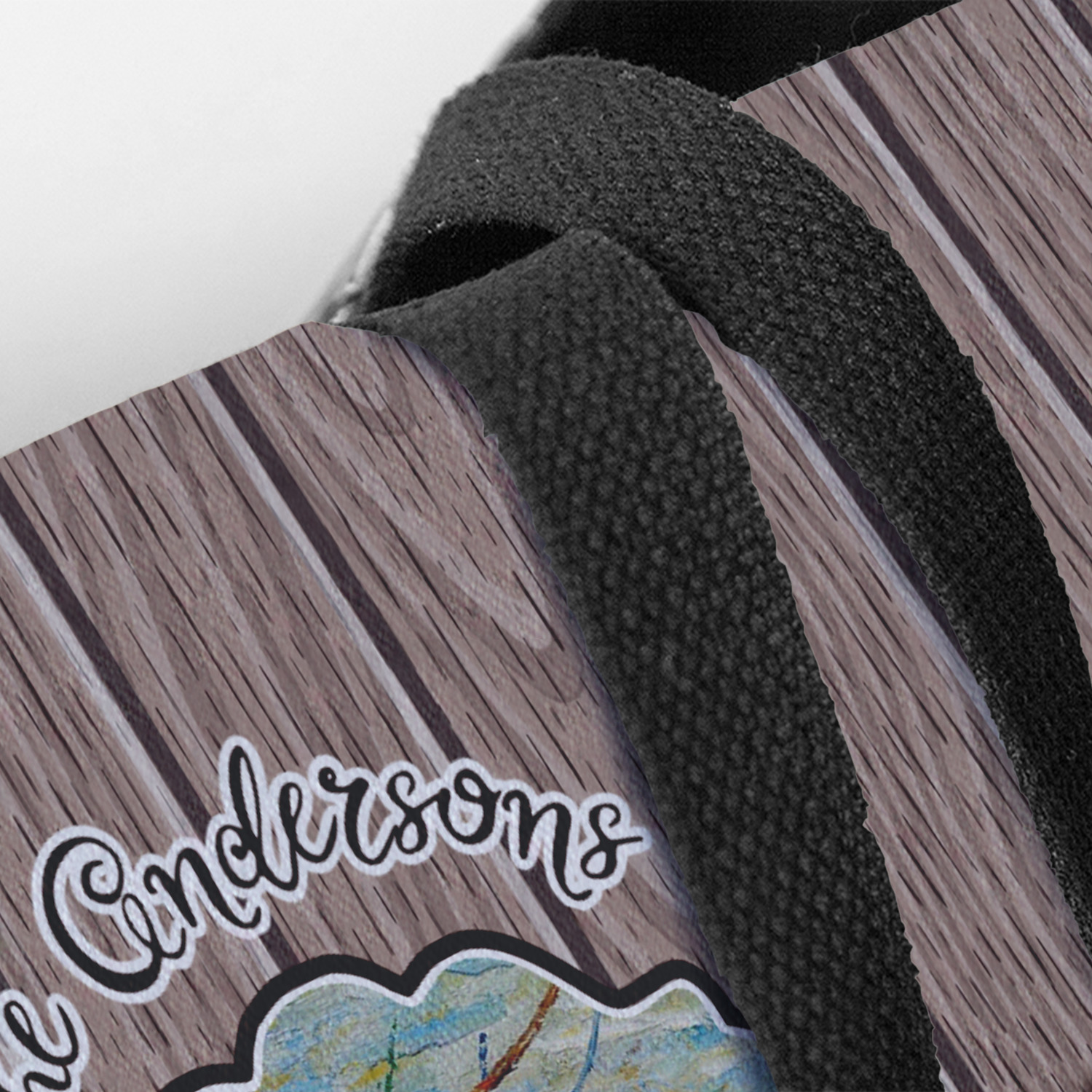 The totes are made from a sturdy canvas material on the outside and are lined with a black poly cotton lining. The beach totes have an approx. 28" black woven handles.
