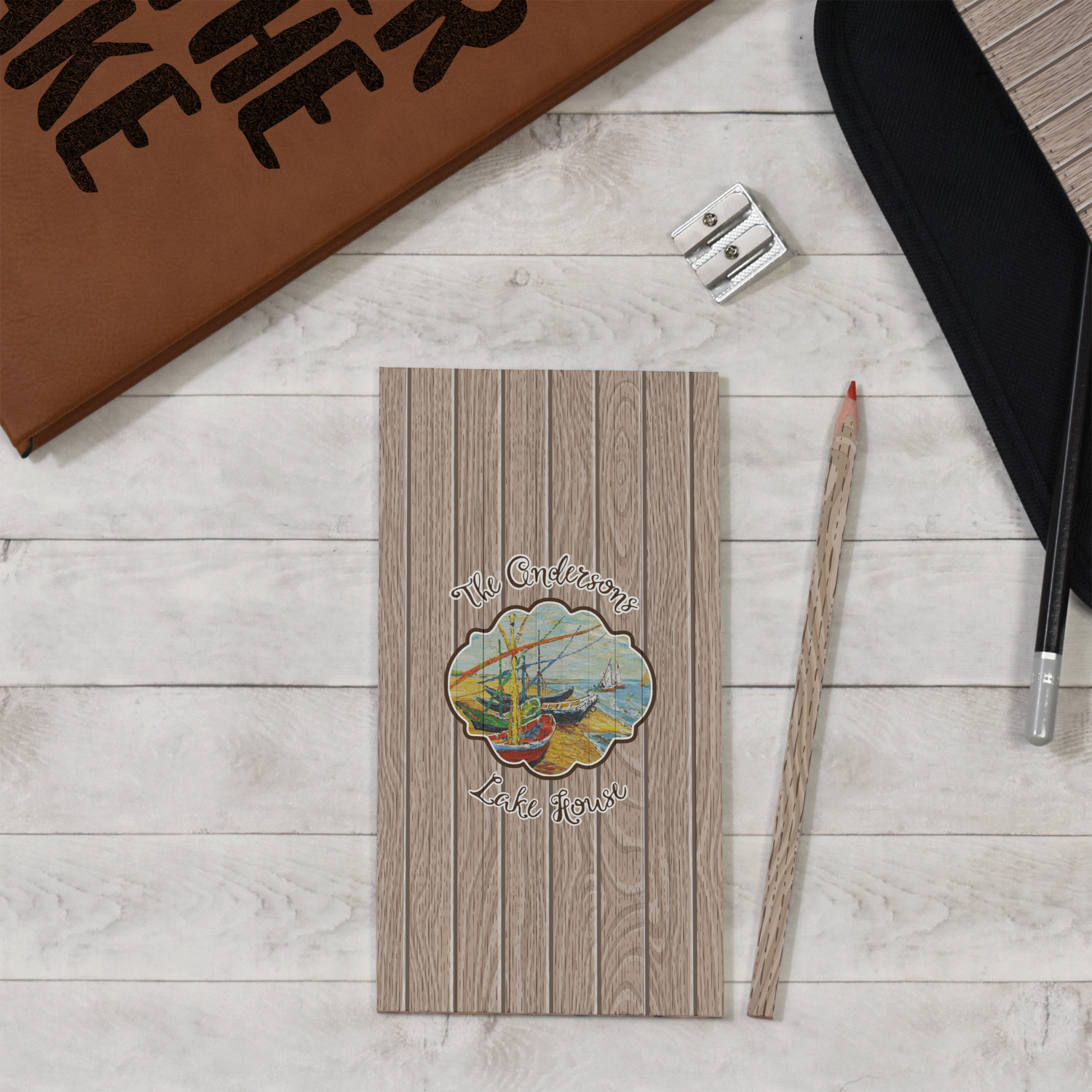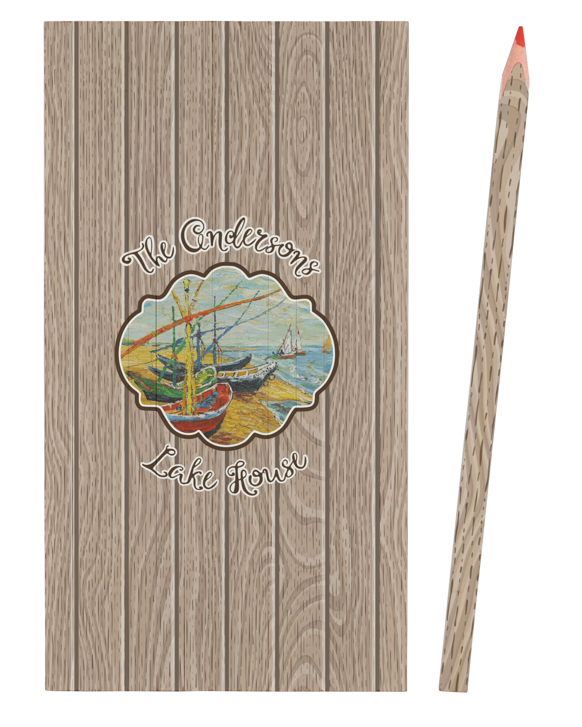Our Lake House design is a combination of classic and chic elements. For our classic element we used Fishing Boats on the Beach by Claude Monet for our center graphic; and for our chic element we used our wooden planks pattern for the background. We choose a neutral sand color for our planks - they can be any color!