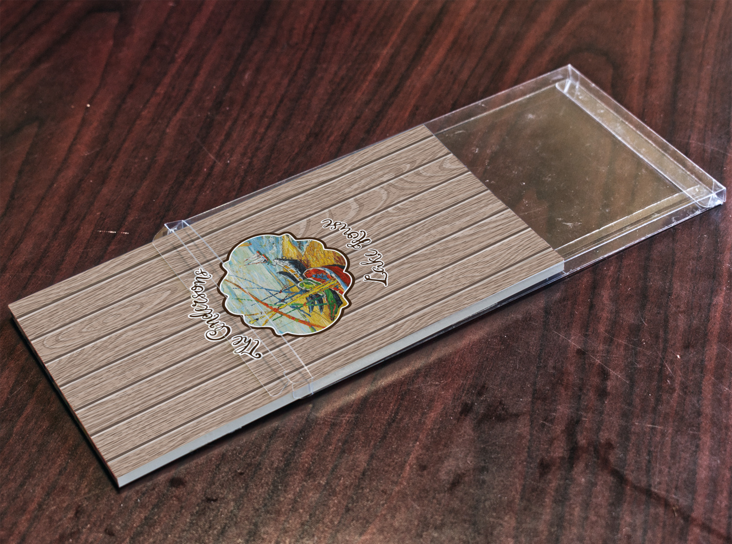 To personalize the design, we used the graphic with arched text style and put the family name on top and Lake House on the bottom. We used a dark chocolate brown for our text color and used our Michelly font with a stroke on it.