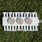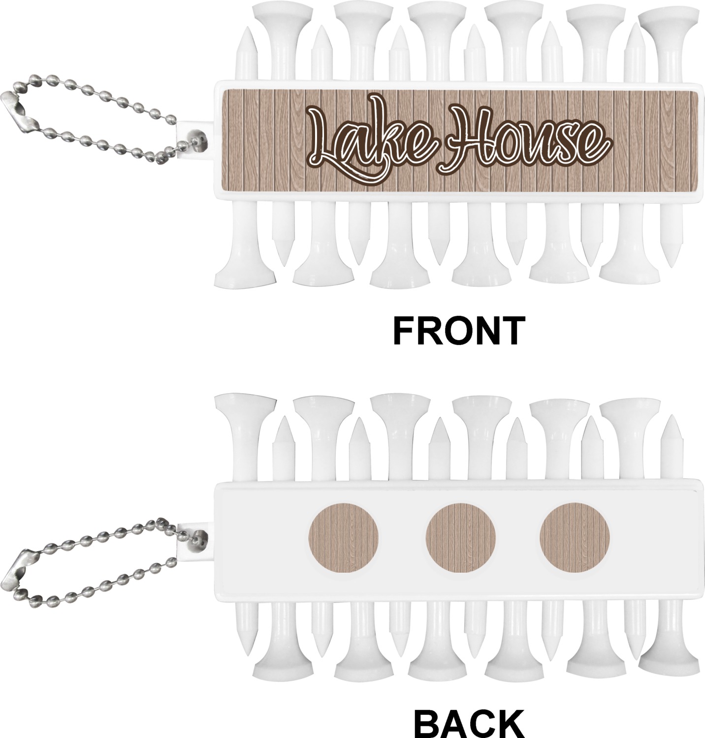 With 12 tees on a lightweight, portable key chain, it almost ensures a great 18 holes. Our tees are made of white plastic and are a little over 2". Design the front and the back of the golf tee holder. Pick from over a hundred designs, colors, and personalization styles! The set even comes with three removable ball markers as well!