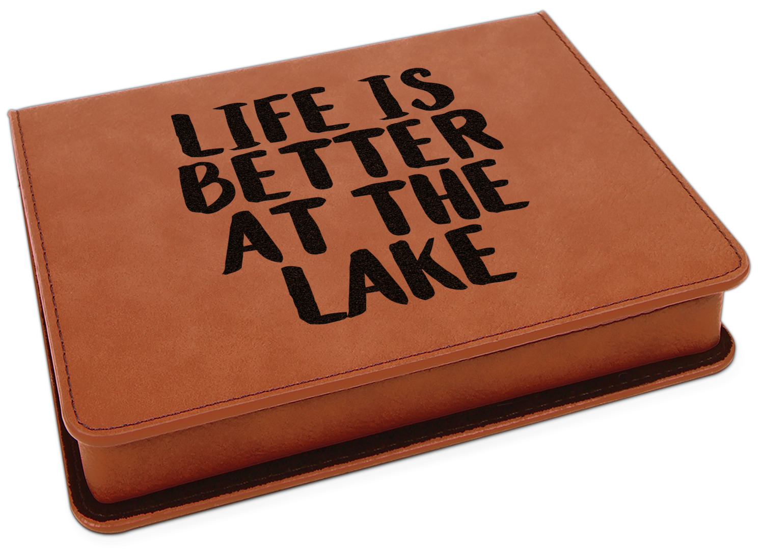 This set includes a wine stopper, pourer, drip ring, and a corkscrew! The exterior of the box is a gorgeous, cognac-brown leatherette, while the interior is covered in a black, velvety material. Four foam indentations, unique to the shape of the wine tool, are found at the bottom half of the box's interior. The tools fit snugly into each of their designated spots, and the foam material helps to protect the integrity of your tools. Each of the wine gadgets features a bamboo accent, with the location and style depending on the tool itself. We laser engrave your personalized design onto the lid of the box, which easily flips open and is secured closed by a small magnet. The wine accessories box measures at 7 by 5.5 inches in total.