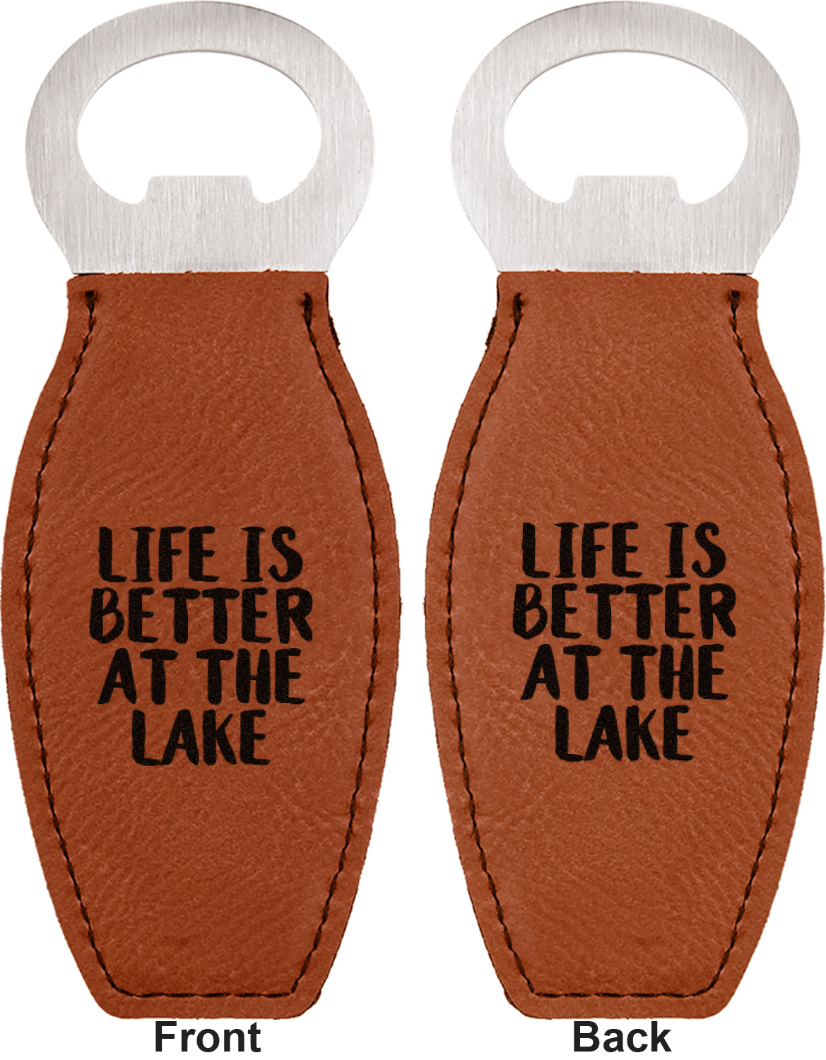 Built from stainless steel, these custom bottle openers are wrapped in a cognac-colored leatherette. Sharp, black stitching lines the edges for extra durability and a finished touch. Your personalization is laser-engraved onto the surface of this leatherette, leaving behind a crisp, black coloration. At 4.6 by 1.8 inches, this beer bottle opener gives you much of leverage when trying to open a stubborn bottle. On the opposite end of the opener, you'll find a magnet that you can use to display your new, unique bottle opener!