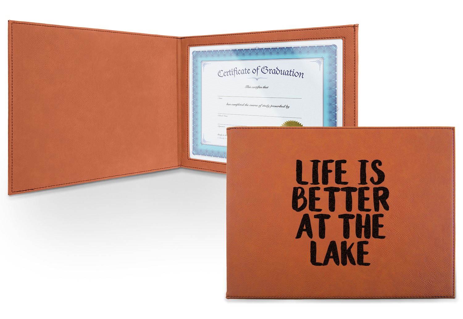 This cognac-colored, leatherette certificate jacket is the ideal way to display or store your hard-earned certificate. When closed, the custom certificate holder measures at 12 by 9 inches. The interior of the certificate cover includes a clear, vinyl window to encase your diploma. The window measures at around 10.5 by 7.5 inches and can accommodate a diploma that measures at up to 8.5 by 11 inches. You can either choose to have your customization laser engraved on the front and interior, or solely the front.