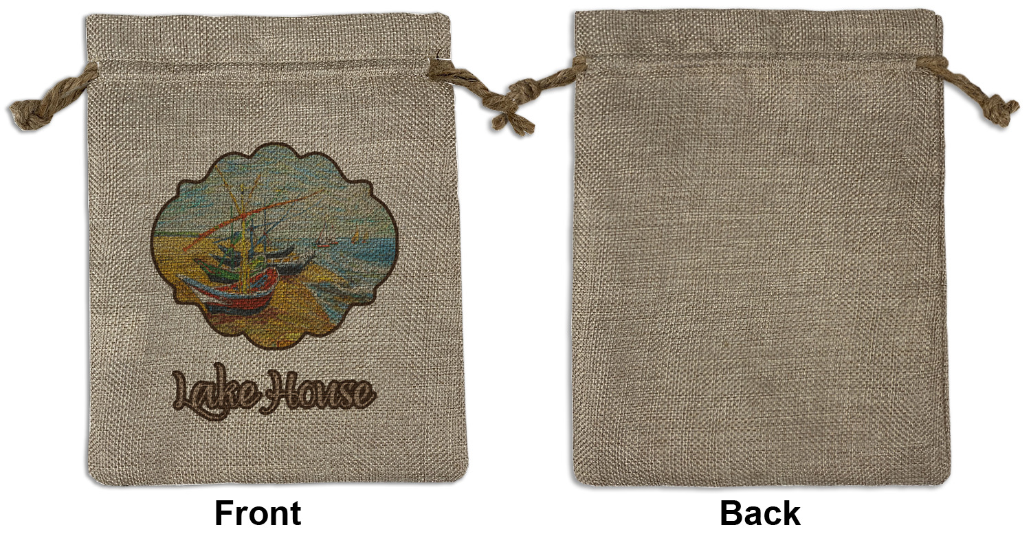 We sell our Burlap Gift Bags in 3 variant sized bags. Made with burlap polyester, each personalized bag can be secured with a twine drawstring pull. Your custom design is available to print on one side or both sides - completely up to you! The sizes of the bags measure approximately 4.5" x 6.5" for the smallest size, 6.5" x 8.0" for the medium size, and 6.5" x 13.5" for the large-sized bag.