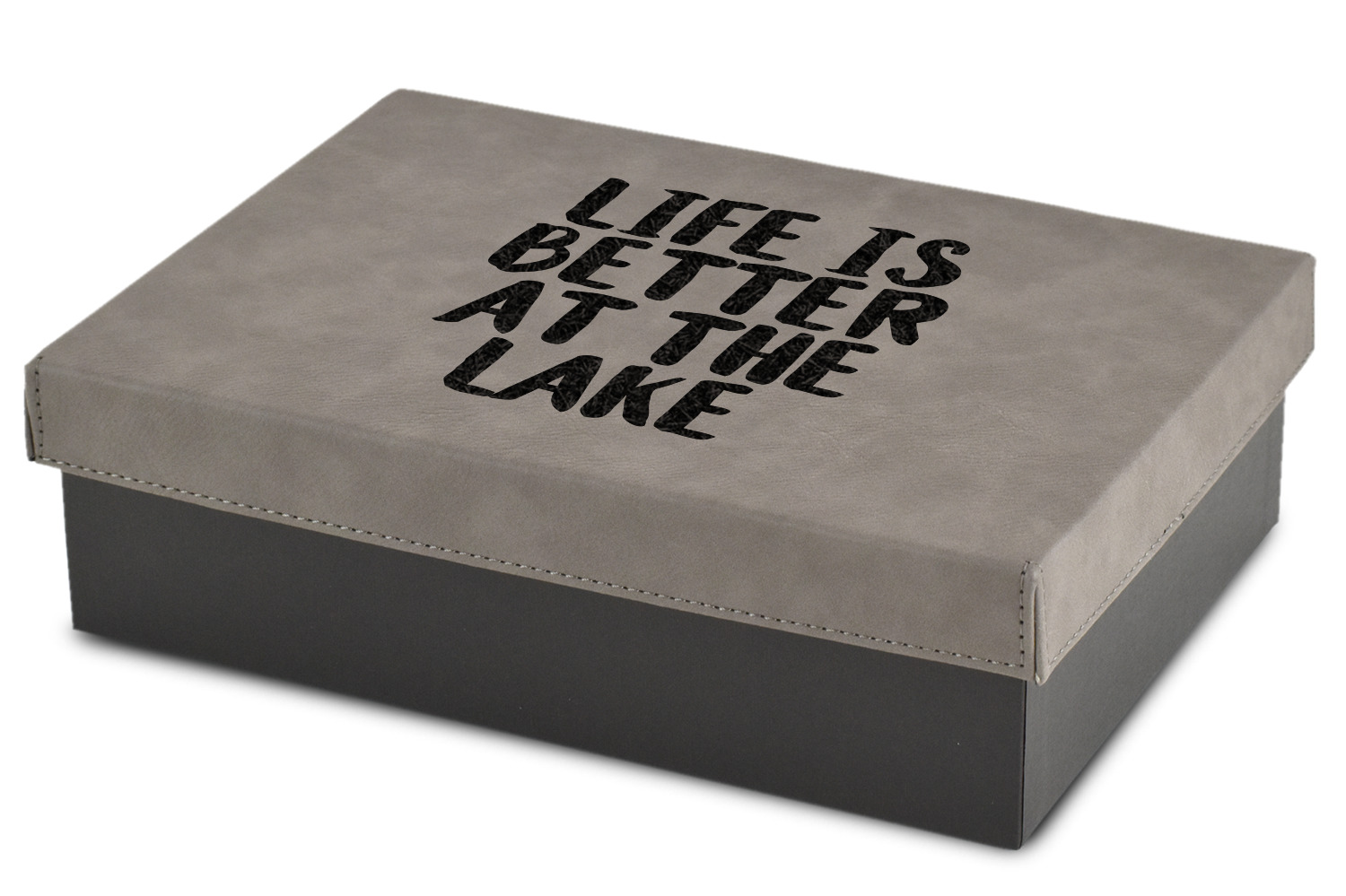 These gift boxes are available in 3 different sizes to accommodate various sized gifts. Available in gray as a neutral color for any occasion as well as to showcase your design boldly. Engraved with a laser this high quality paper board and faux leather gift box is unique and makes any gift stand out.